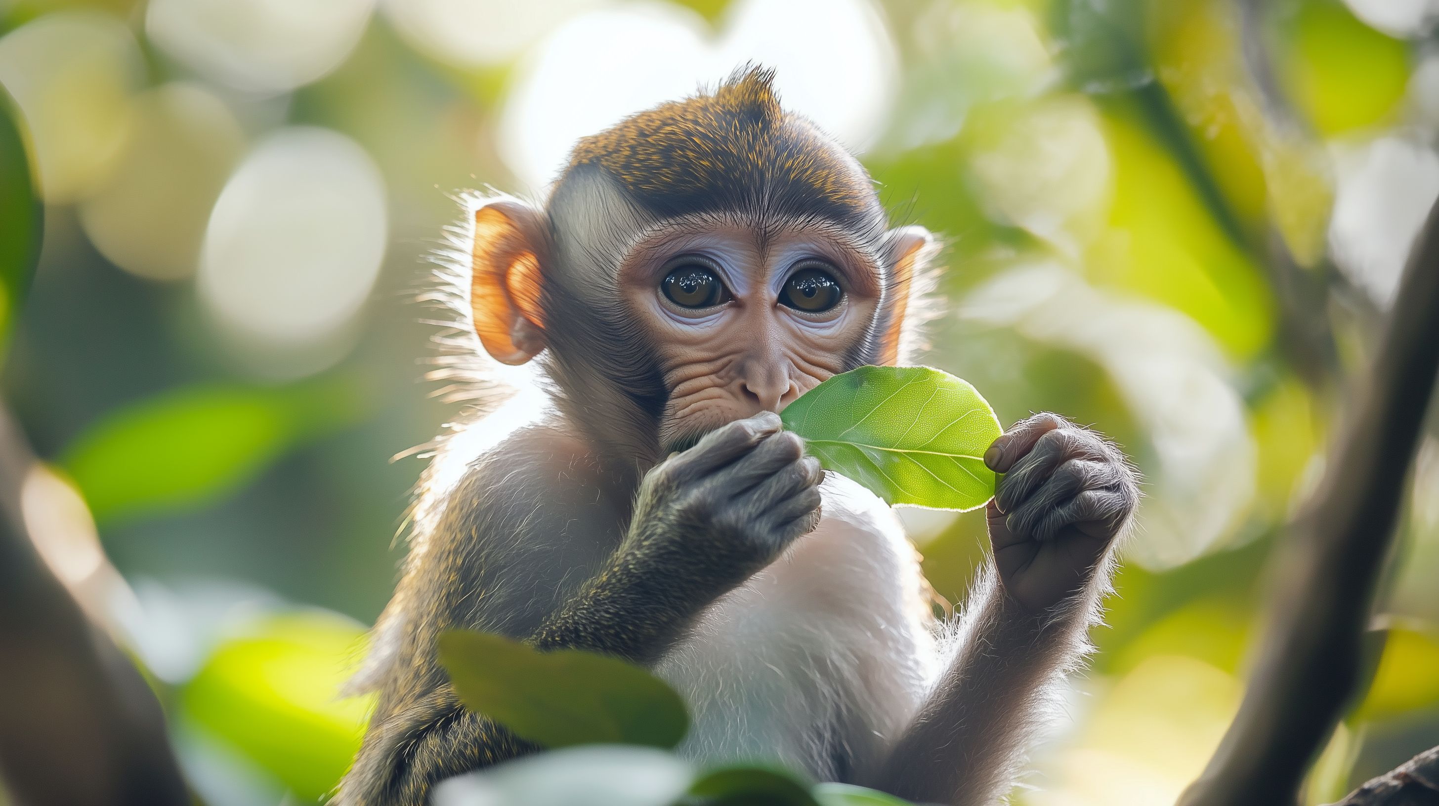 Dieses faszinierende Foto zeigt einen jungen Javaneraffen, der vorsichtig ein grünes Blatt in seinen Händen hält. Der Affe blickt mit einem unschuldigen und neugierigen Ausdruck direkt in die Kamera, was eine sanfte, natürliche Stimmung erzeugt. Die Schärfe und Feinheit der Details sowie das weiche Bokeh-Hintergrundmuster verleihen dem Bild eine hochwertige, professionelle Anmutung. Dieses kostenfreie Stockfoto in hoher Auflösung eignet sich hervorragend für Verwendungen in Blogs, Newslettern, sozialen Medien oder Werbematerialien, bei denen eine natürliche, tierische Ästhetik gewünscht ist. Es steht unter einer Creative-Commons-Lizenz zur Verfügung.