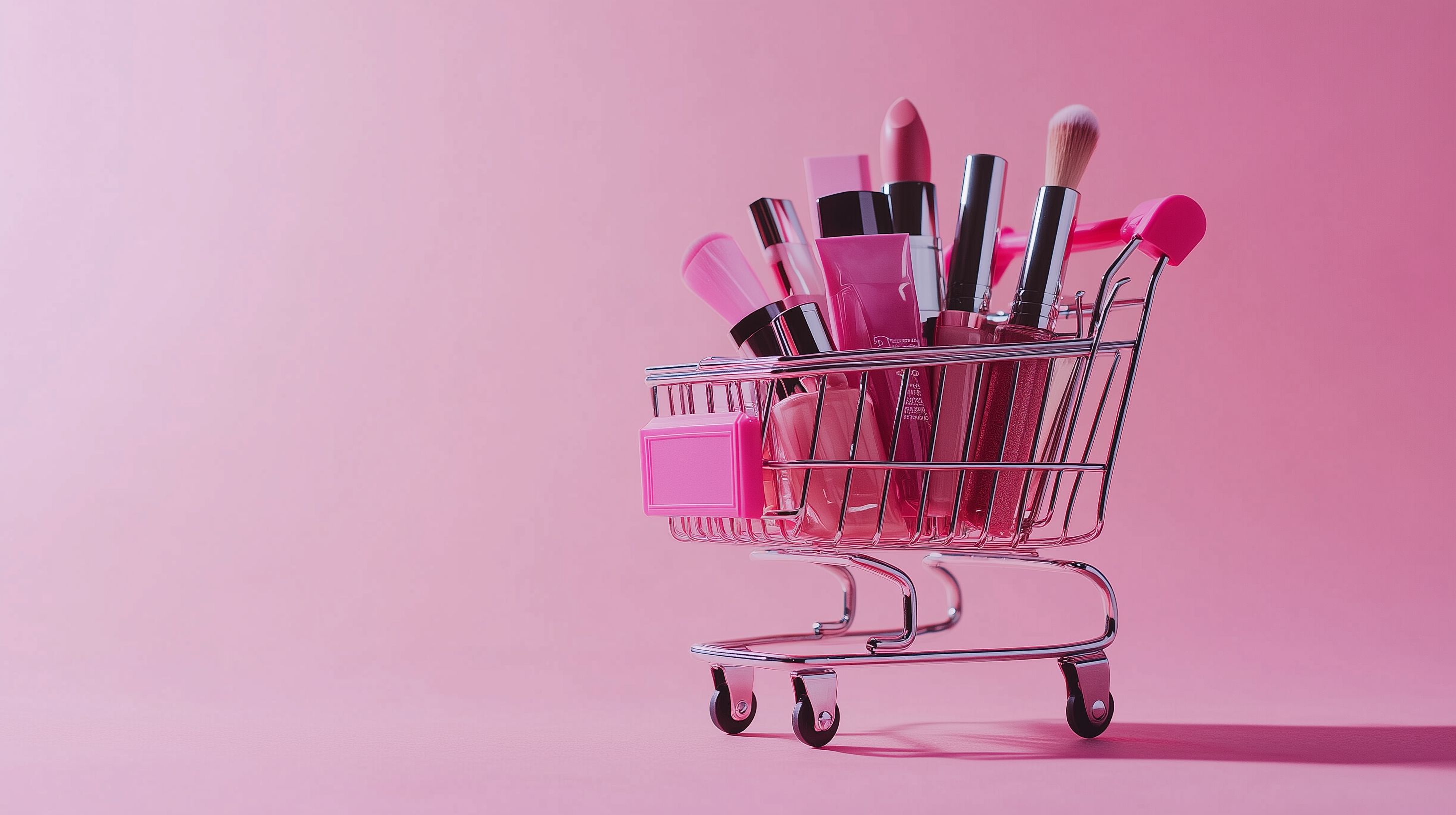 Dieses Bild zeigt eine Nahaufnahme verschiedener Kosmetikprodukte, die in einem Einkaufswagen platziert sind. Der Hintergrund ist in einem kräftigen Rosa gehalten, was den Produkten eine besonders feminine und einladende Ausstrahlung verleiht. Die Anordnung der Produkte, wie Lippenstifte, Pinsel und Lidschatten, suggeriert einen Einkaufsvorgang und eignet sich daher hervorragend für Werbezwecke in den Bereichen Schönheit, Mode und Wellness. Dieses hochauflösende Stockfoto ist kostenfrei unter der Creative-Commons-Lizenz verfügbar und kann für verschiedene Anwendungen wie Blogbeiträge, Social-Media-Postings oder Newsletter genutzt werden.