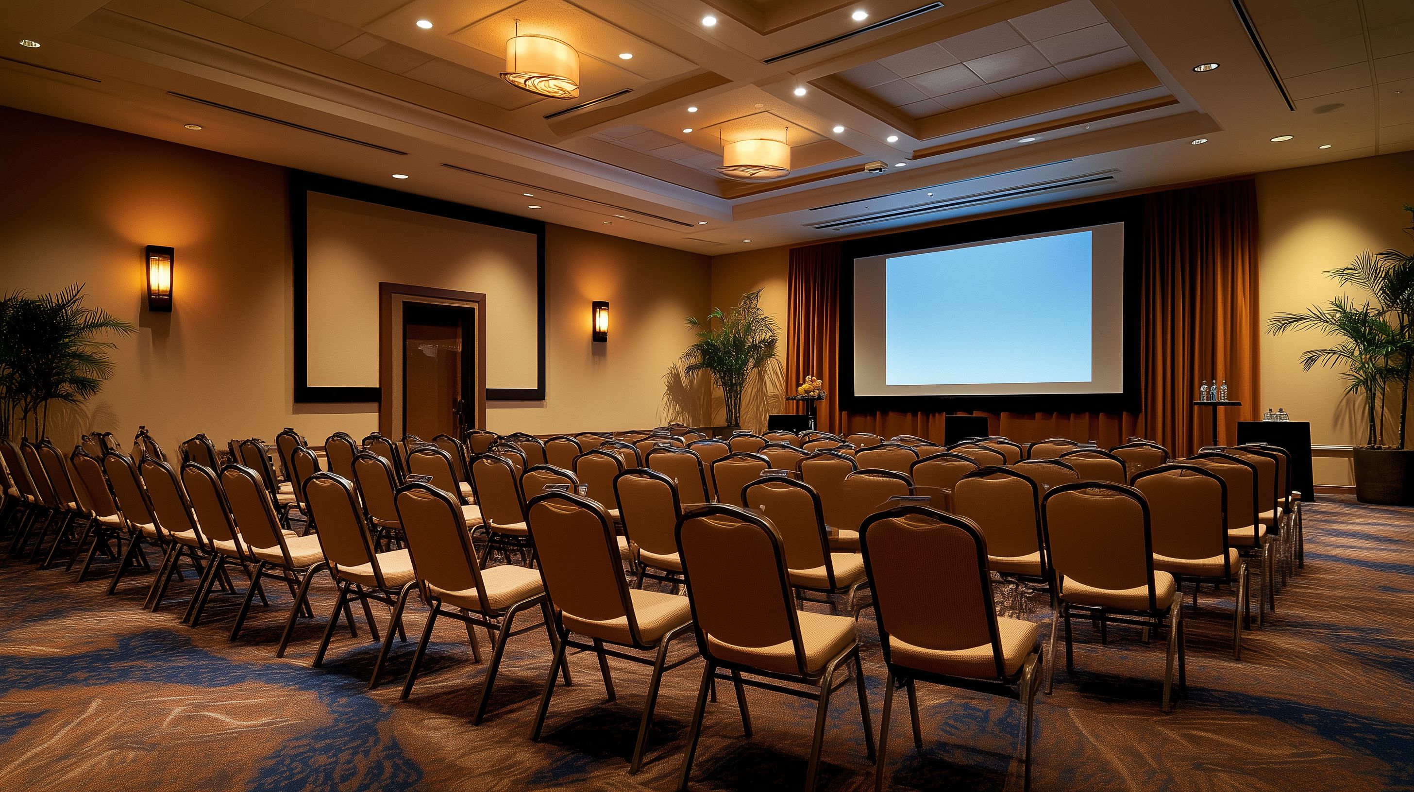 Dieses Foto zeigt einen großzügigen Konferenzraum mit gemütlicher Atmosphäre. Der Raum ist mit Holzmöbeln, Holzvertäfelung und warmer Beleuchtung ausgestattet. Im Vordergrund sieht man reihenweise Stühle, die auf eine Präsentationsleinwand am Ende des Raums ausgerichtet sind. An den Seiten stehen Palmen, die das Ambiente ergänzen. Insgesamt vermittelt der Raum einen einladenden und professionellen Eindruck, der sich ideal für Firmenpräsentationen, Seminare oder Tagungen eignet.