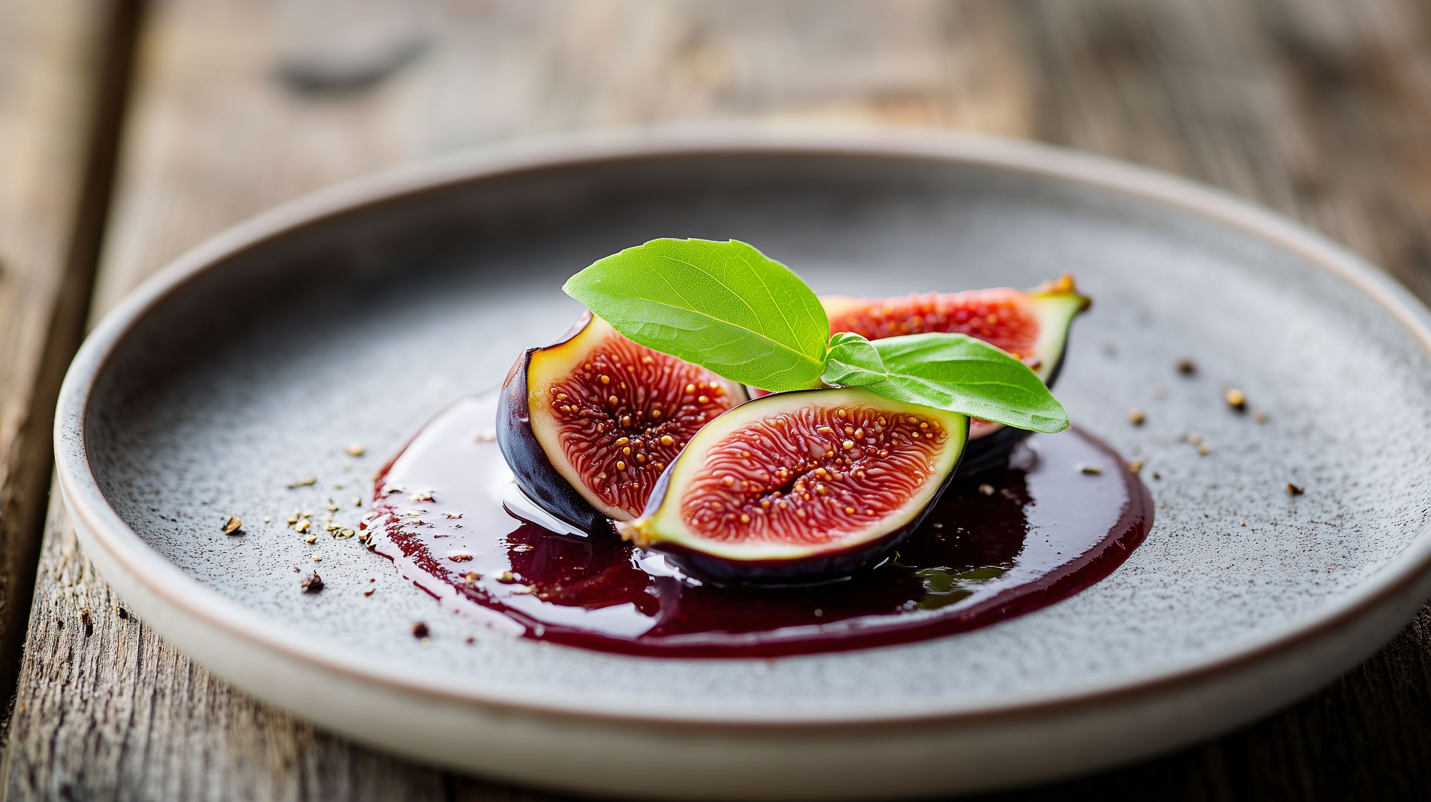 Dieses Foto zeigt eine elegante Präsentation von reifen, saftigen Feigen auf einem grauen Teller. Die Früchte sind kunstvoll angerichtet und mit einer dunkelroten Früchtesauce oder Glace garniert. Grüne Blätter und feine Gewürze runden die Komposition ab. Das Bild strahlt eine natürliche, hochwertige Ästhetik aus und eignet sich hervorragend als kostenloses Stockfoto für Rezepte, Foodblogs, Menükarten, Einladungen zu Feierlichkeiten oder Werbematerial im Gastronomie- und Cateringbereich. Mit seiner hohen Auflösung und der Lizenz unter Creative Commons können Unternehmen und Privatpersonen das Foto frei und kostenfrei für ihre Projekte nutzen.