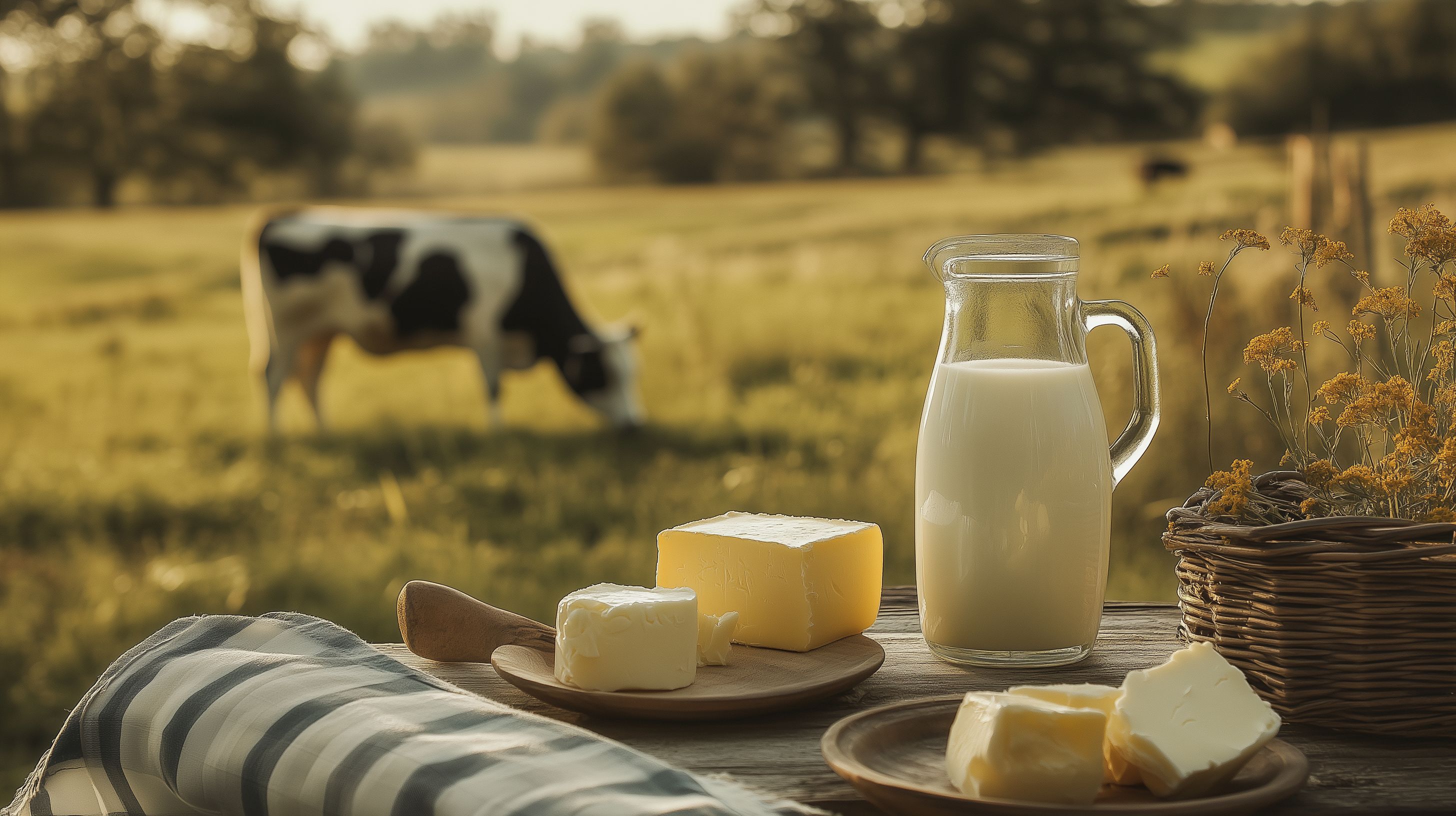 Dieses idyllische Foto zeigt eine rustikale Aufnahme von frischen Milchprodukten auf einem Holztisch in einer ländlichen Sommerlandschaft. Im Vordergrund sind eine Milchkanne, Butter und Käsestücke zu sehen. Im Hintergrund befindet sich eine Kuh auf einer Wiese, was den Bezug zur Landwirtschaft und Herkunft der Produkte herstellt. Die warme, goldene Farbgebung und das natürliche Licht schaffen eine gemütliche, entspannende Atmosphäre. Dieses kostenlose Stockfoto in hoher Auflösung eignet sich hervorragend für den Einsatz in Blogs, Newslettern, Social-Media-Beiträgen oder Werbematerialien im Bereich Landwirtschaft, Ernährung und nachhaltiger Lebensstil.