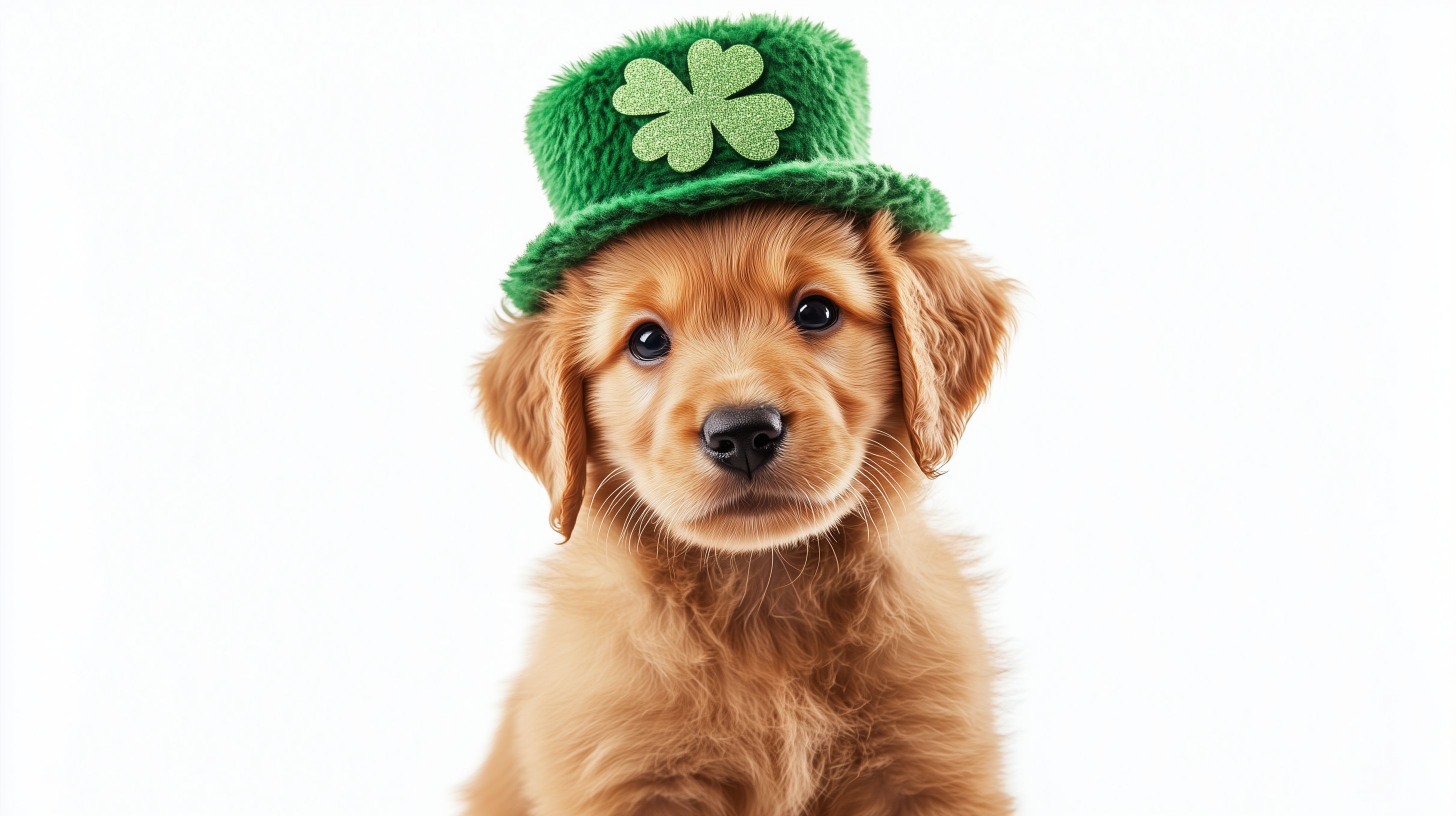 Dieses entzückende Foto zeigt einen goldfarbenen Welpen mit einem grünen Hut voller Glücksklee-Blätter. Der Hund blickt mit großen, freundlichen Augen direkt in die Kamera und scheint das St. Patrick's Day-Outfit zu genießen. Das Bild strahlt eine fröhliche, festliche Stimmung aus und eignet sich perfekt für Einsätze rund um den irischen Nationalfeiertag, etwa in Blogbeiträgen, Newslettern oder Social-Media-Beiträgen. Das hochauflösende Foto ist unter einer Creative-Commons-Lizenz frei nutzbar.