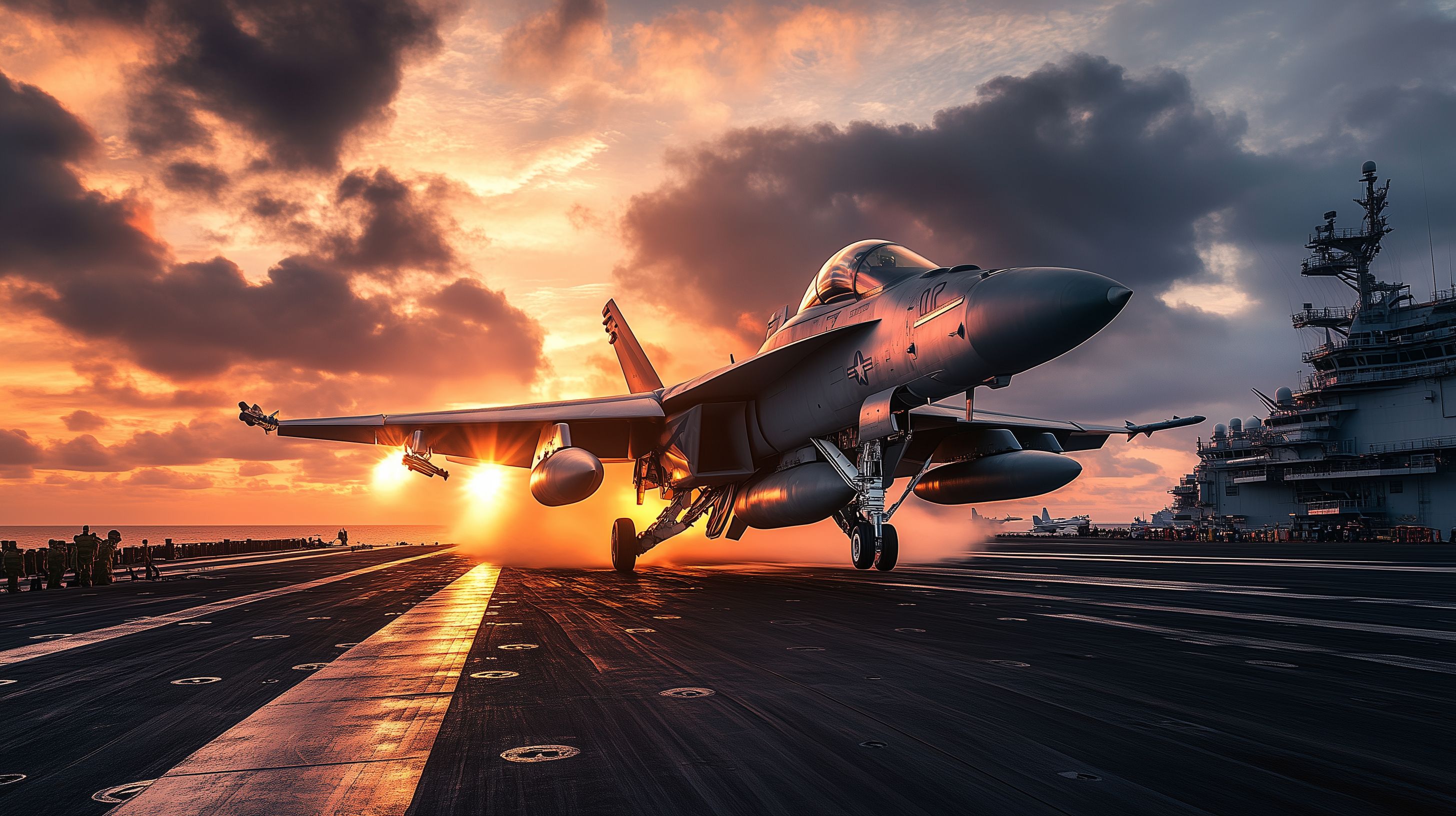 Dieses eindrucksvolle Foto zeigt einen Kampfjet, der bei einem dramatischen Sonnenuntergang auf einem Flugzeugträger landet. Die kräftigen, orangefarbenen Lichter des Himmels spiegeln sich auf der Oberfläche des Flugdecks wider, was der Szene eine beinahe surreale Atmosphäre verleiht. Der Jet hebt sich mit seinen markanten Flügelformen und der aggressiven Linienführung deutlich vom ruhigen Hintergrund ab. Dieses hochauflösende Foto eignet sich hervorragend für den Einsatz in Artikeln, Blogbeiträgen oder Werbekampagnen mit Bezug zur Luftfahrt, Militärtechnik oder allgemeinen Technologiethemen. Als kostenloses Stockfoto unter Creative-Commons-Lizenz kann es frei verwendet werden.