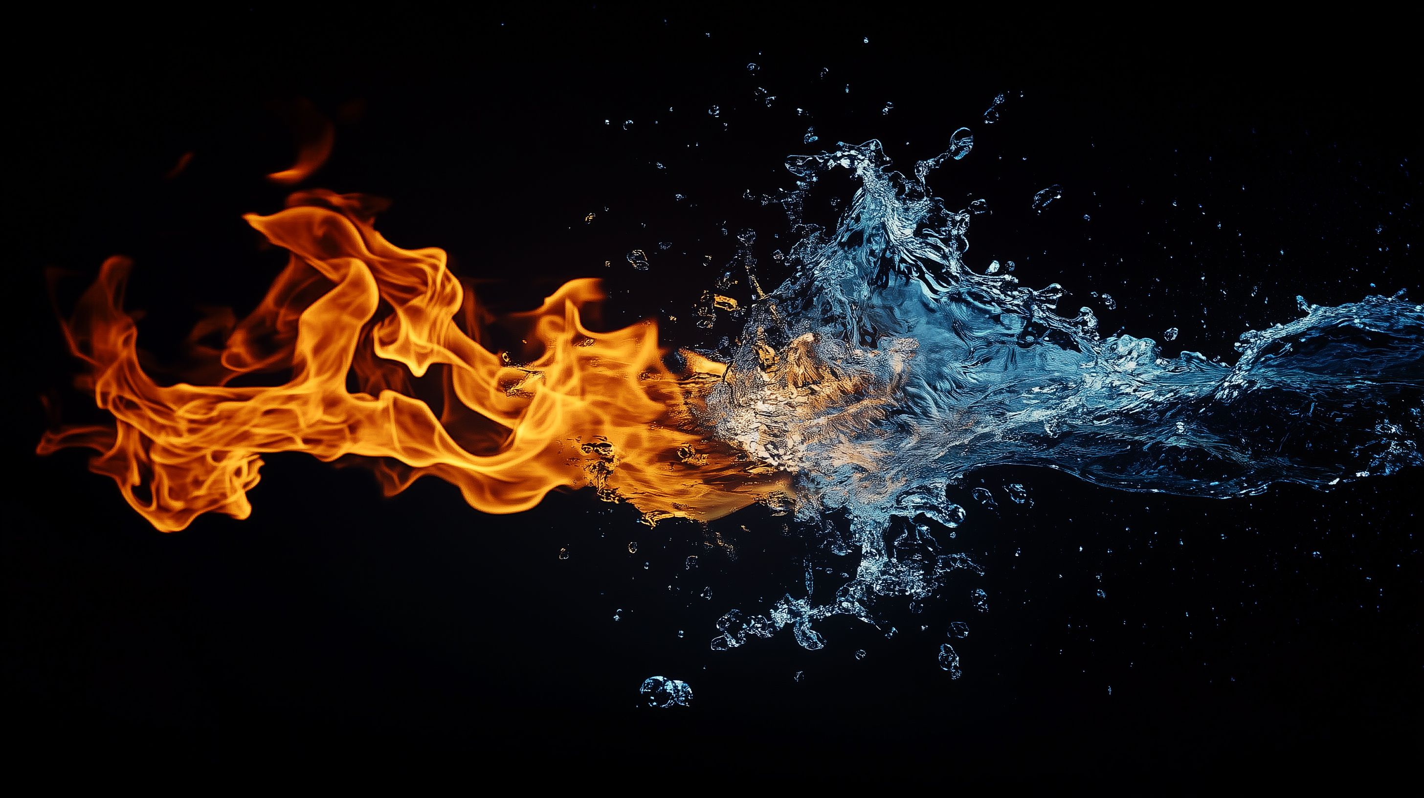 Das beeindruckende Bild zeigt eine spektakuläre Begegnung von Feuer und Wasser. In einer dramatischen Szene prallen die lodernden Flammen auf die wild sprudelnden Wassermassen, die sich zu einem faszinierenden Schauspiel der Elemente vereinen. Die Komposition ist perfekt ausgewogen, mit dem dunklen Hintergrund, der die Farbgewalt und Energie der Hauptmotive noch unterstreicht.