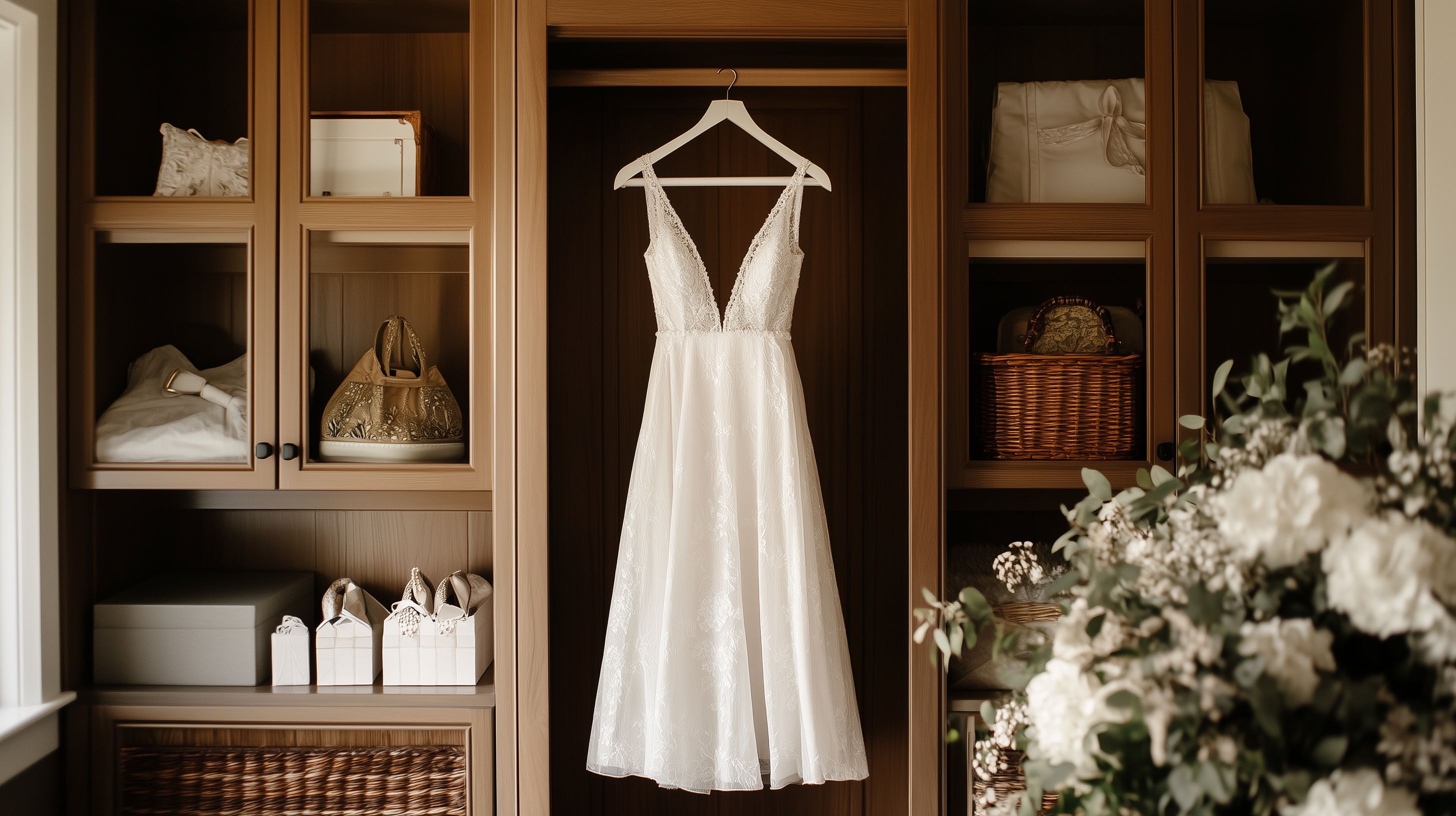 Dieses Foto zeigt ein wunderschönes, weißes Brautkleid, das elegant in einem Holzschrank mit Regalen und Accessoires präsentiert wird. Das Kleid ist mit feinen Details und Spitze verziert und hängt bereit für den großen Tag an einem Bügel. Um das Kleid herum finden sich weitere Hochzeitsutensilien wie Körbe, Blumendekoration und andere Accessoires, die eine stimmungsvolle, romantische Atmosphäre schaffen. Das Foto eignet sich perfekt als kostenloses Stockfoto für Hochzeitsblogbeiträge, Hochzeitseinladungen, Werbeanzeigen und vieles mehr. Es ist in hoher Auflösung verfügbar und kann unter der Creative-Commons-Lizenz verwendet werden.