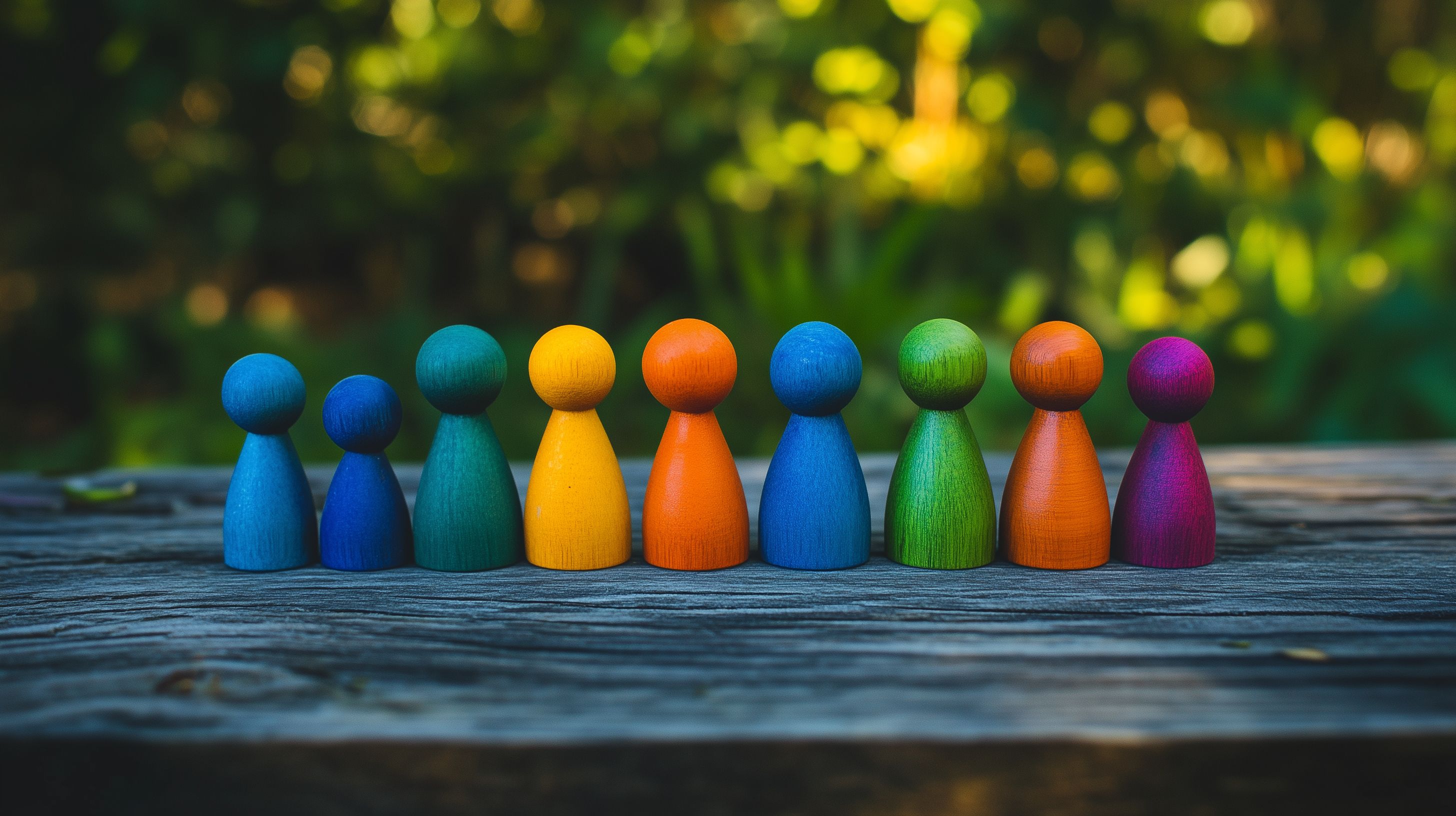 Dieses Bild zeigt eine Reihe farbenfroher, hölzerner Spielfiguren, die auf einem alten, rustikalen Holztisch platziert sind. Die Figuren sind in verschiedenen Größen und Farben gestaltet, von leuchtendem Blau und Grün bis hin zu kräftigem Orange und Pink. Die Anordnung der Figuren vermittelt den Eindruck von Vielfalt, Zusammenhalt und Gemeinschaft.
