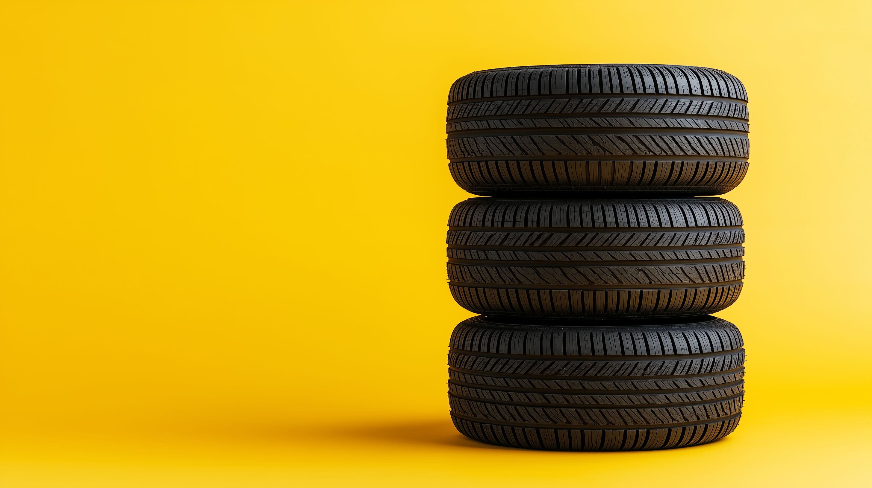 Das Bild zeigt einen Stapel von drei schwarzen Autoreifen vor einem leuchtend gelben Hintergrund. Die Reifen sind sauber und in einem guten Zustand, mit deutlich sichtbaren Profilmustern. Die Anordnung der Reifen ist minimalistisch und freigestellt, was die Aufmerksamkeit auf die Reifen selbst lenkt. Dieses Stockfoto eignet sich hervorragend für den Einsatz in Artikeln, Werbungen oder Social-Media-Beiträgen rund um das Thema Autoreifen, Autoersatzteile oder Fahrzeugreparatur. Es ist in hoher Auflösung verfügbar und kann unter einer Creative-Commons-Lizenz kostenlos genutzt werden.
