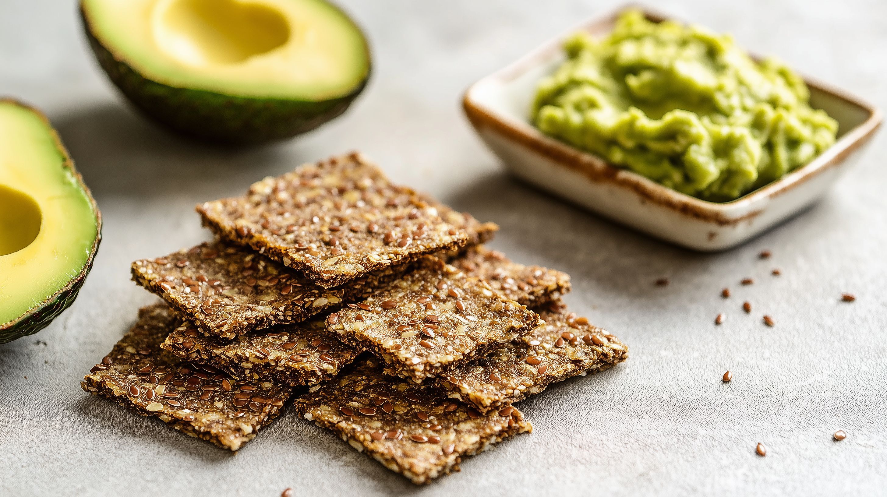 Dieses appetitliche Foto zeigt einen Teller mit knusprigen Leinsamen-Crackern, die mit einer cremigen Avocado-Guacamole belegt sind. Die Cracker haben eine natürliche, leicht getoastete Optik und werden von zwei halbierten Avocados umrahmt, die ihre grüne Farbenpracht betonen. Das Gericht strahlt Frische und Gesundheit aus und eignet sich perfekt als Snack, Vorspeise oder Appetizer. Das hochauflösende Stockfoto ist kostenlos und unter einer Creative-Commons-Lizenz verfügbar, sodass es sich ideal für Blogs, Websites, Newsletter oder Werbekampagnen rund um gesunde Ernährung, Superfood und vegetarische Küche eignet.