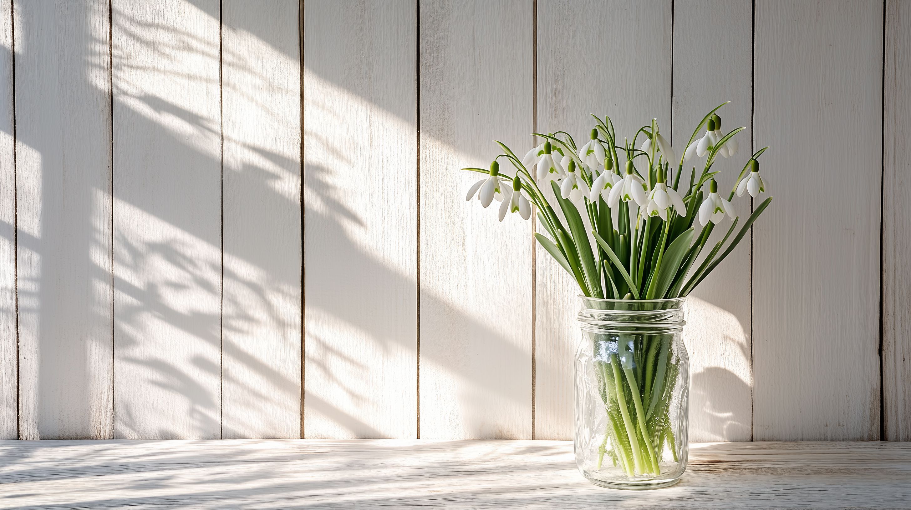 Das Foto zeigt einen schlichten, aber stimmungsvollen Strauß aus zarten Schneeglockenblüten in einer rustikalen Glasvase. Die weißen Blüten heben sich vor dem hellen Holzhintergrund mit Schattenwurf ab und verströmen eine frische, naturnahe Atmosphäre. Die Komposition ist einfach und reduziert, lässt den Fokus ganz auf die Blumen zu. Dieses kostenloses Stockfoto in hoher Auflösung eignet sich hervorragend für Frühlingsthemen in Blogs, Newslettern, Werbung und Social Media unter einer Creative Commons-Lizenz.