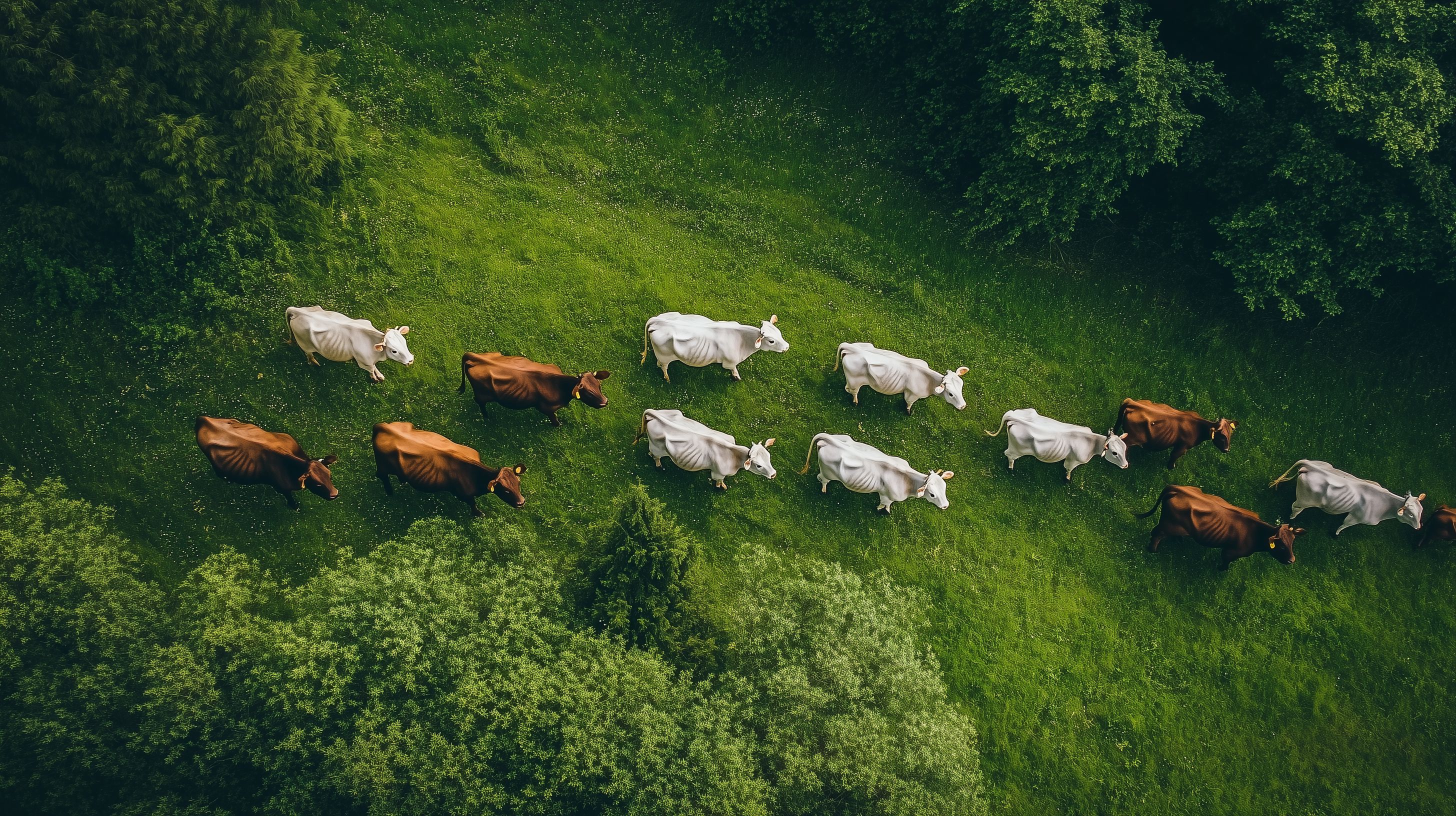 Diese luftige Aufnahme zeigt eine Herde von Kühen, die friedlich auf einer grünen Wiese grasen. Die Tiere sind in verschiedenen Brauntönen gehalten, während die weißen Kühe daraus hervorstechen. Die Perspektive aus der Luft lässt die Szene idyllisch und malerisch erscheinen, als wäre sie aus einem Gemälde entsprungen. Dieses Stockfoto eignet sich hervorragend für den Einsatz in Blogs, Newslettern, Social-Media-Beiträgen oder Werbematerialien, die eine naturnahe, ländliche Atmosphäre vermitteln wollen. Das hochaufgelöste Bild steht unter einer Creative-Commons-Lizenz kostenfrei zur Verfügung.