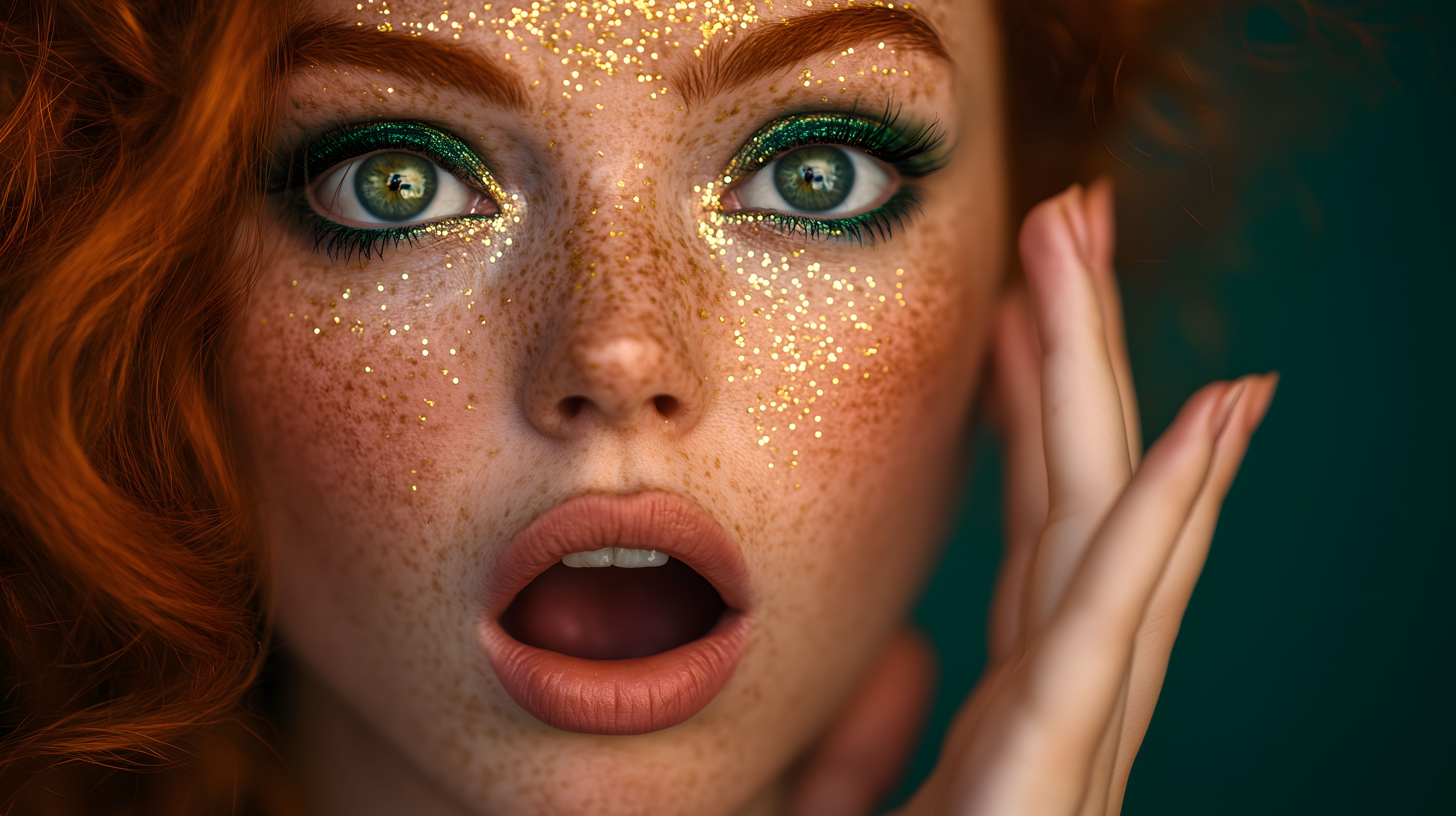Dieses faszinierende Porträt zeigt eine geheimnisvolle rothaarige Frau mit funkelndem, überraschendem Blick. Der Fokus liegt auf dem Gesicht, das von goldenen Glitzerpunkten umrahmt ist, die eine mystische Stimmung erzeugen. Die Augen der Frau stehen im Mittelpunkt und fesseln den Betrachter mit einem faszinierenden, fast magischen Ausdruck. Dieses hochauflösende Stockfoto eignet sich hervorragend für den Einsatz in Blogs, Newslettern, Social-Media-Kampagnen oder Werbematerialien, bei denen ein geheimnisvoller, emotionaler Blickfang gewünscht ist. Das Bild steht unter einer Creative-Commons-Lizenz zur kostenlosen Verwendung zur Verfügung.