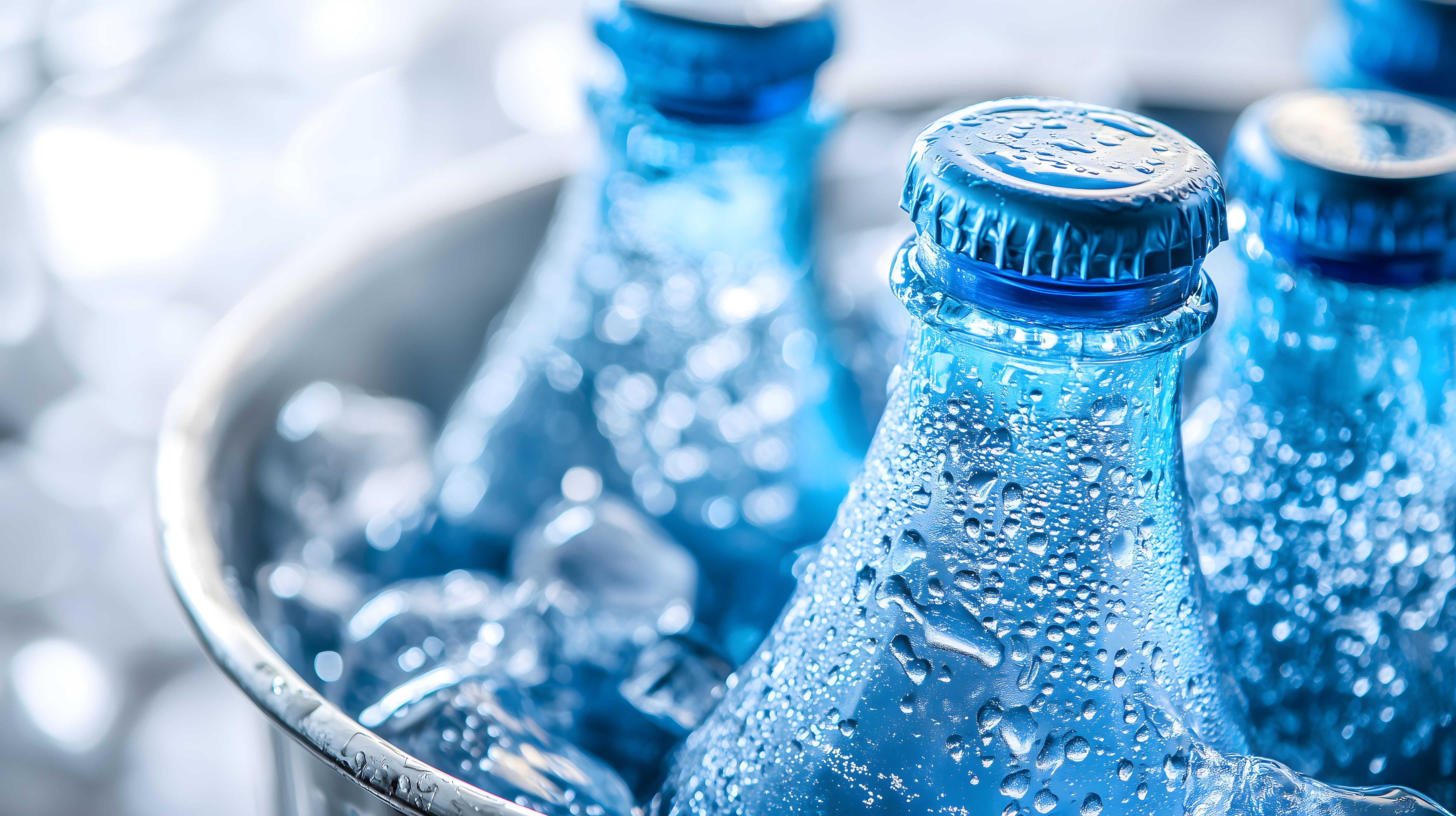 Das Bild zeigt verschiedene Getränkeflaschen in einem Eisbad. Die Flaschen sind mit Kondenswasser bedeckt, was den erfrischenden Eindruck verstärkt. Durch die Perspektive aus der Vogelperspektive und die Unschärfe im Hintergrund liegt der Fokus klar auf den gekühlten Flaschen. Dieses Foto eignet sich perfekt für den Einsatz in Blogs, Newslettern, Social-Media-Posts oder Werbematerialien rund um das Thema Erfrischung, Gastronomie oder Sommererlebnisse. Als kostenloses Stockfoto in hoher Auflösung und unter Creative-Commons-Lizenz kann es vielfältig und ohne Einschränkungen genutzt werden.