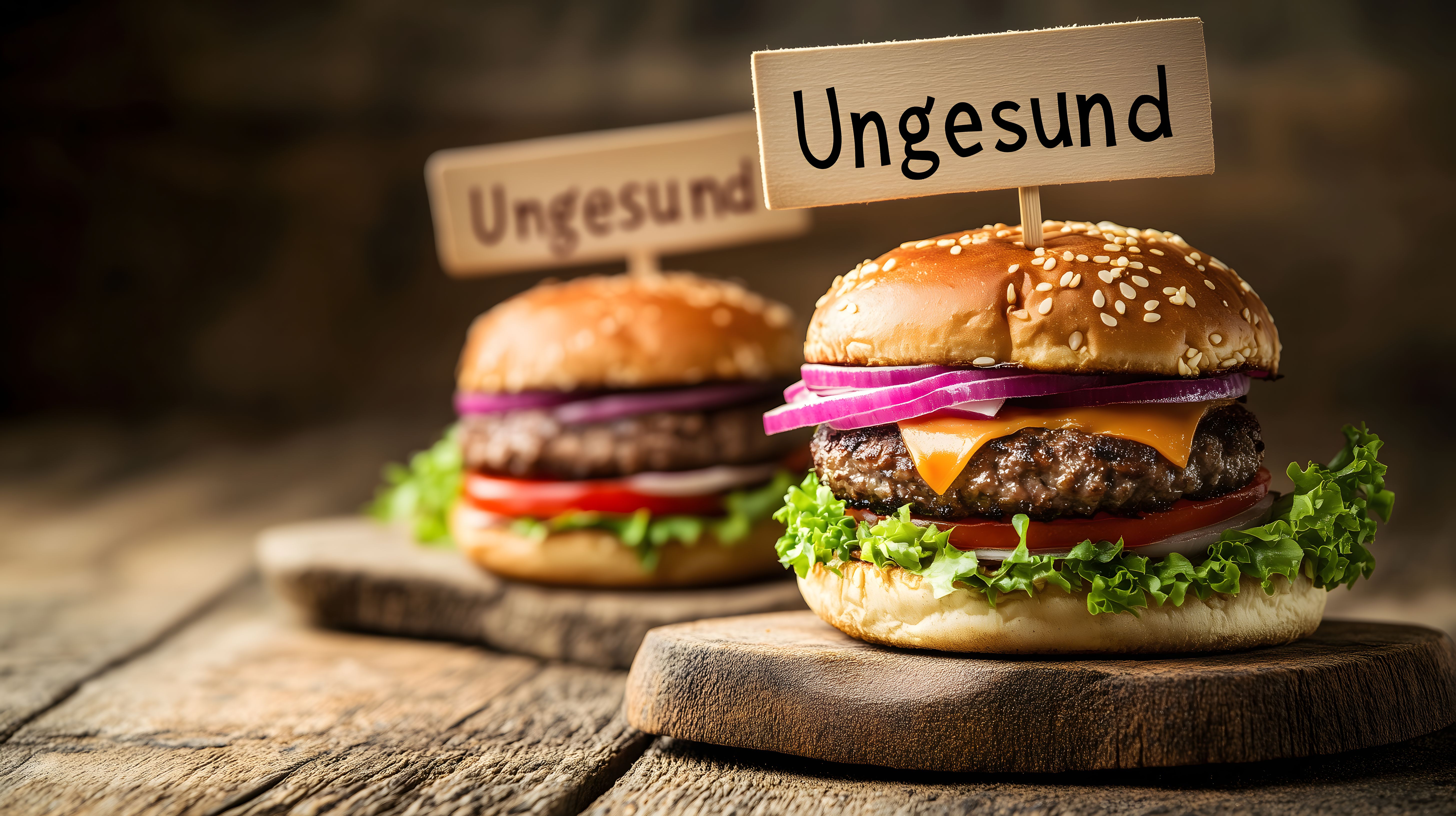 Dieses Foto zeigt zwei verlockend aussehende Burger auf einem rustikalen Holzbrett. Die Burger sind mit Zutaten wie Hackfleisch, Käse, Tomaten, Salat und Zwiebeln belegt und sehen sehr appetitanregend aus. Auf Holzschildern ist der Schriftzug 'Ungesund' zu lesen, was einen ironischen Kontrast zu dem verlockenden Essen darstellt. Das Foto ist professionell in einem Studio aufgenommen, mit scharfer Fokussierung und guter Ausleuchtung. Es eignet sich hervorragend für die Verwendung in Blogbeiträgen, Newslettern, sozialen Medien oder Werbematerialien rund um das Thema Ernährung, Kulinarik oder Lifestyle. Das hochauflösende Bild steht unter einer Creative-Commons-Lizenz kostenlos zum Download zur Verfügung.