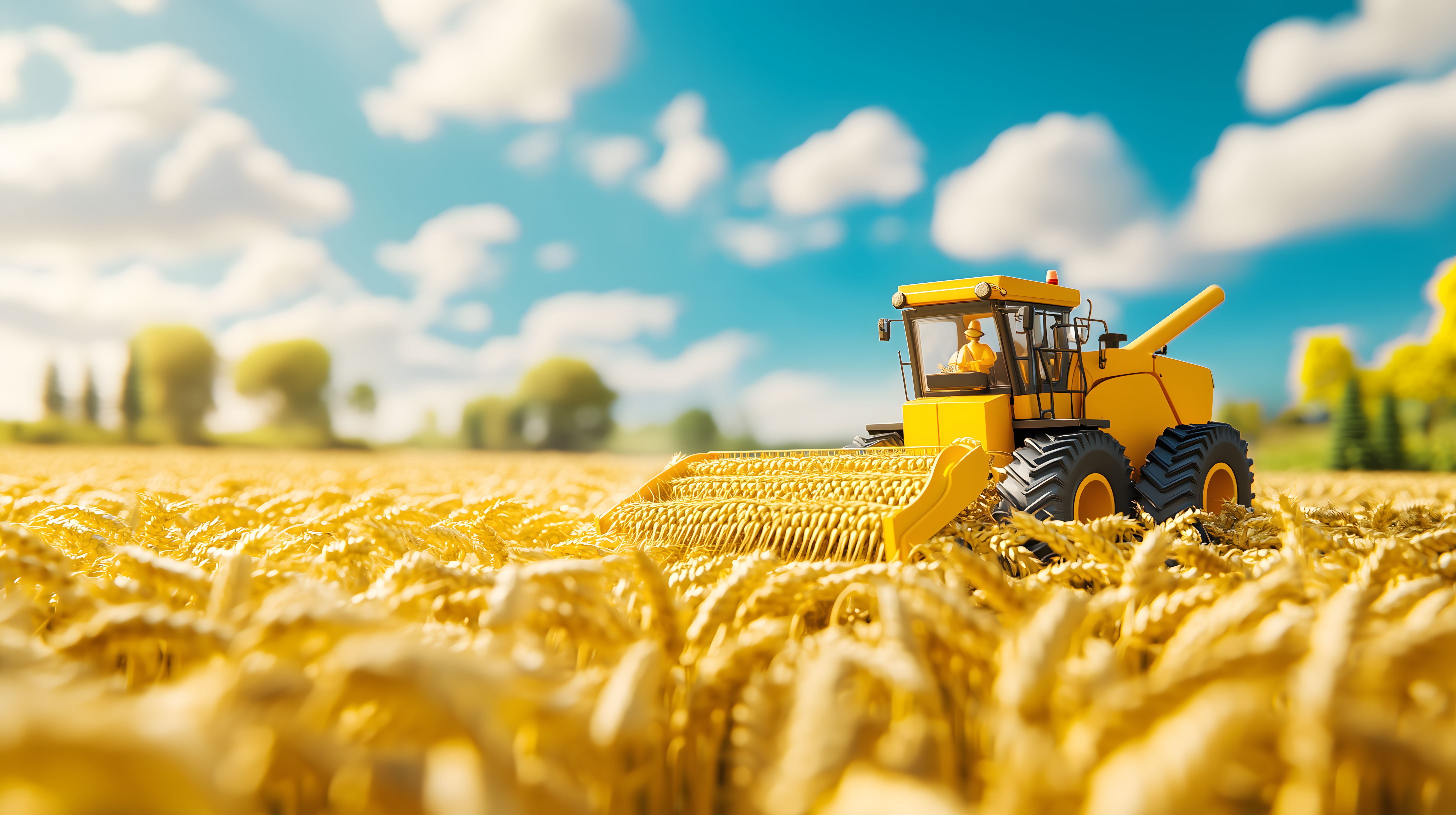 Das Bild zeigt eine Miniaturszene eines Weizenfeldes während der Ernte. Eine gelbe Erntemaschine fährt über das goldgelbe Getreidefeld, das sich unter einem wolkenverhangenen, blauen Himmel erstreckt. Die detailreiche Darstellung, die an ein 3D-Rendering erinnert, verleiht der Szene eine fast surreale Anmutung. Das Foto könnte ideal als kostenloses Stockfoto für Beiträge und Werbung im Bereich Landwirtschaft, Ernte oder Natürliches verwendet werden. Die hochauflösende Auflösung und Creative-Commons-Lizenz machen das Bild leicht zugänglich und vielseitig einsetzbar, etwa für Blog-Posts, Newsletter oder Social-Media-Kampagnen.