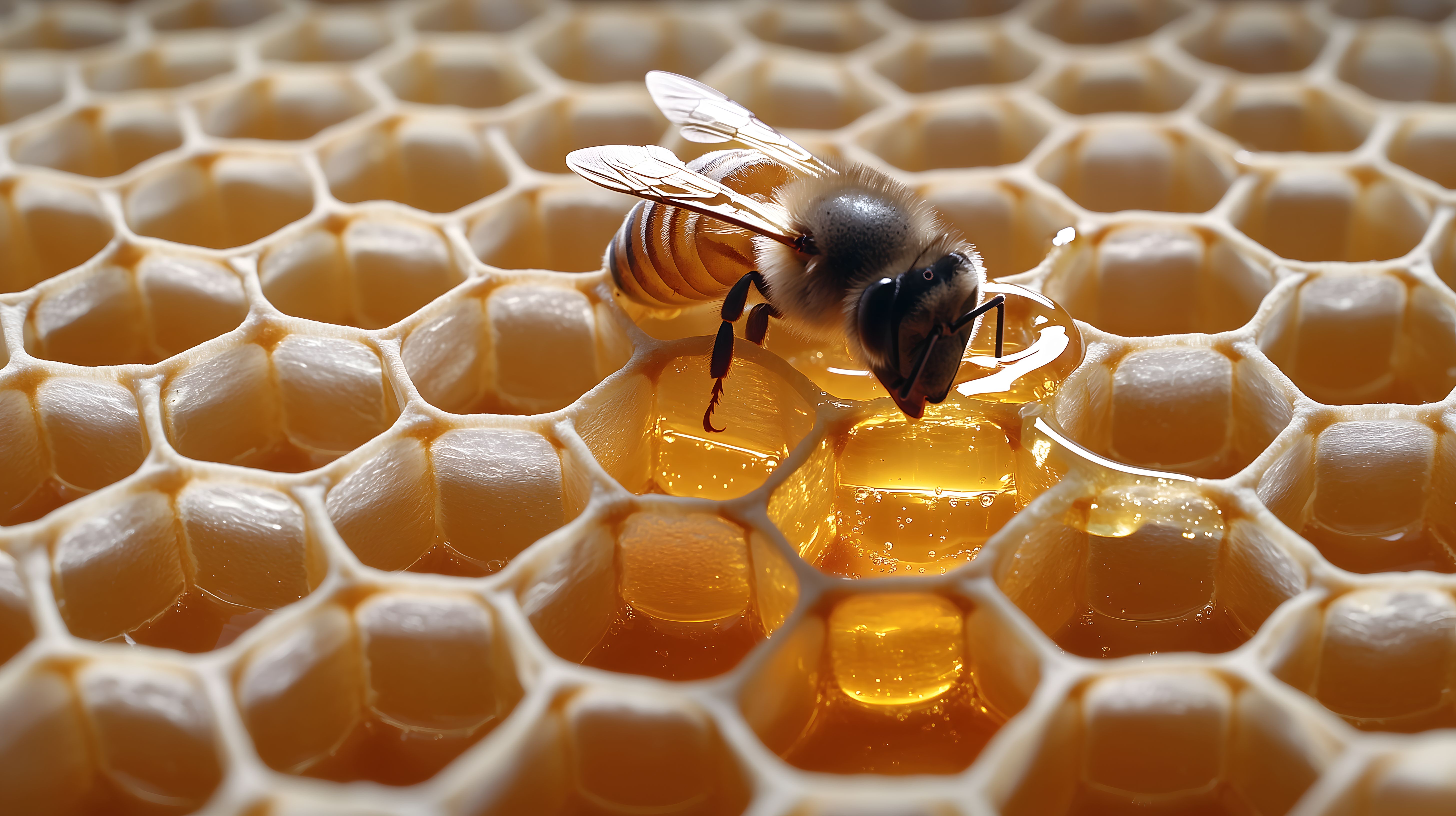 Dieses Foto zeigt eine Nahaufnahme einer Honigbiene, die auf einer wunderschönen Bienenwabe sitzt. Die Wabe ist mit goldenen, sechseckigen Zellen gefüllt, in denen sich der frisch gewonnene Honig befindet. Die Biene ist in scharfer Fokussierung zu sehen, mit ihren charakteristischen Flügeln und ihrem behaarten Körper. Das Bild besticht durch die detailreichen Strukturen und die warmen, natürlichen Farbtöne, die eine stimmungsvolle und ästhetische Atmosphäre schaffen. Dieses hochauflösende Stockfoto eignet sich hervorragend für die Verwendung in Blogbeiträgen, Newsletter-Gestaltung, Social-Media-Posts oder Werbematerialien rund um das Thema Honig, Bienen, Imkerei oder Naturschutz. Es steht unter einer Creative-Commons-Lizenz zur kostenlosen Nutzung zur Verfügung.