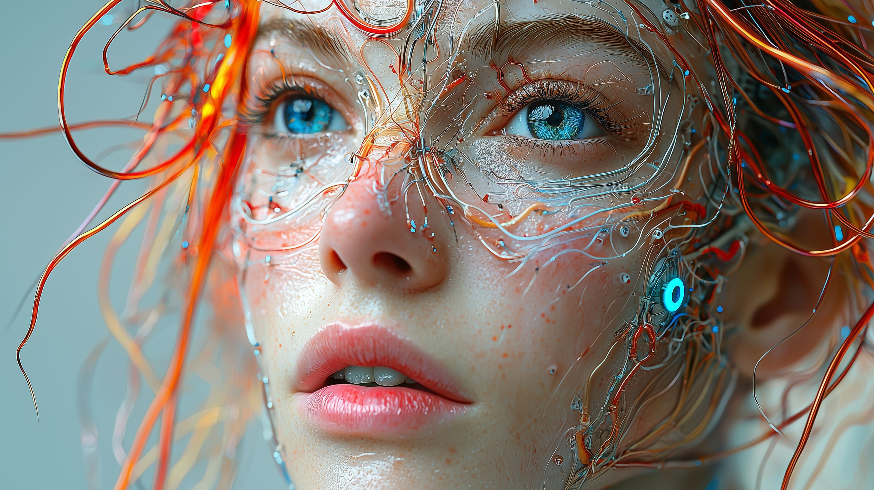 Dieses faszinierende digitale Kunstwerk zeigt das Gesicht einer futuristischen Roboter-Frau in einer surrealen, bunten Darstellung. Die Haut ist von cyberpunk-artigen Kabeln und Strukturen überzogen, die dem Gesicht einen einzigartigen, technologischen Charakter verleihen. Die außergewöhnlichen blauen Augen und die detaillierten Gesichtszüge schaffen einen beeindruckenden Kontrast zur technischen Ästhetik. Dieses Stockfoto eignet sich hervorragend für Blogs, Newsletter, Social-Media-Posts oder Werbekampagnen in den Bereichen Technologie, Zukunft, Sci-Fi und digitale Kunst. Es ist in hoher Auflösung verfügbar und unter einer Creative-Commons-Lizenz frei nutzbar.