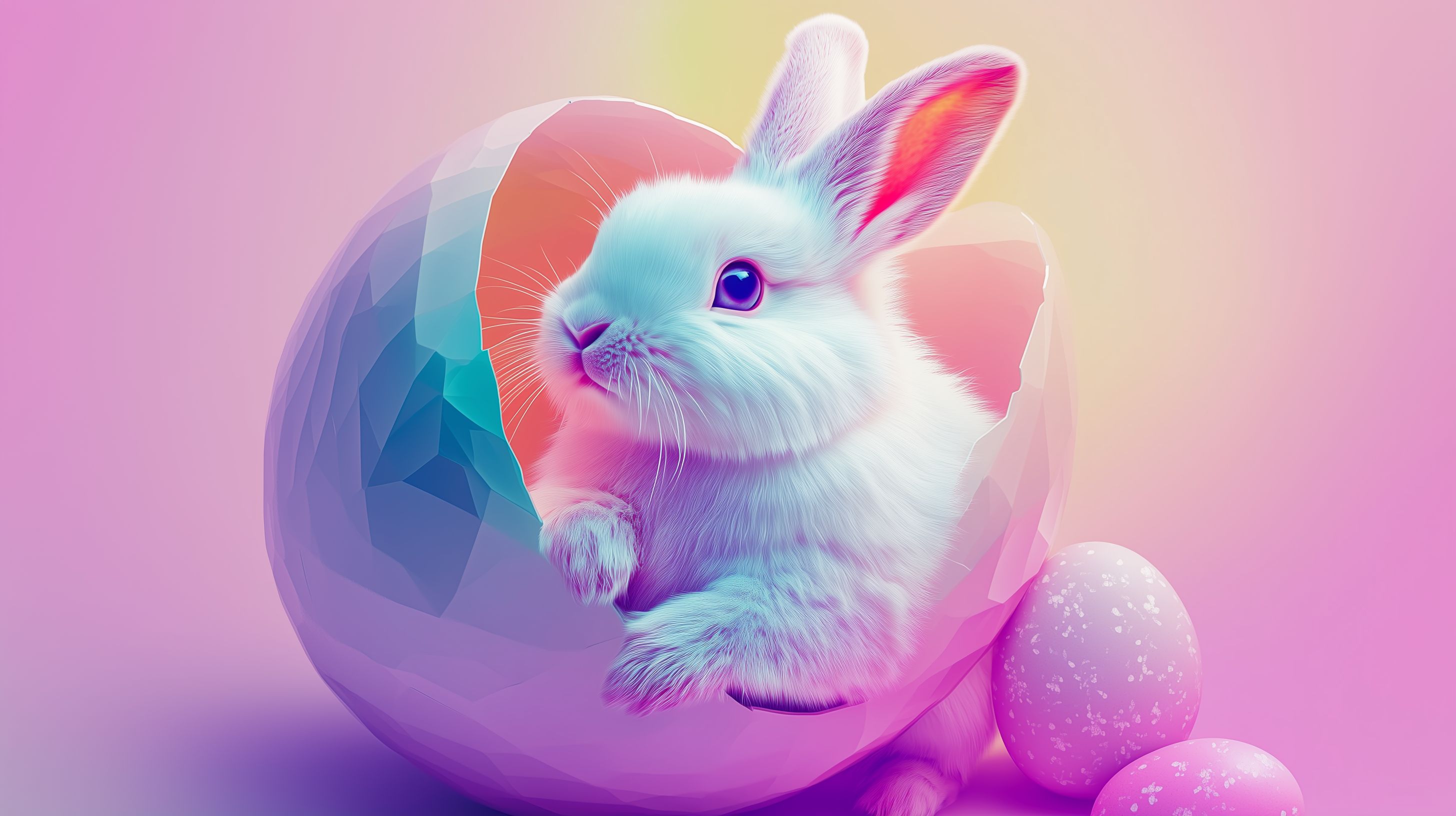 Das Bild zeigt einen niedlichen, flauschigen Osterhasen, der in einem bunten, polygonalen Ei sitzt. Der Hase ist in zarten Pastelltönen von Blau, Lila und Rosa gehalten, was eine sehr sanfte, frühlingshaft-fantasievolle Atmosphäre erzeugt. Das Ei im Hintergrund ist ebenfalls in pastelligen, harmonischen Farben gestaltet und verleiht dem Motiv zusätzliche Tiefe. Dieses Foto eignet sich hervorragend als kostenloses Stockfoto für Oster-Projekte, Frühlingskampagnen oder kreative Designs in Blog-Beiträgen, Newslettern und auf Social-Media-Kanälen. Die hochauflösende Datei steht unter einer Creative-Commons-Lizenz zum kostenlosen Download zur Verfügung.