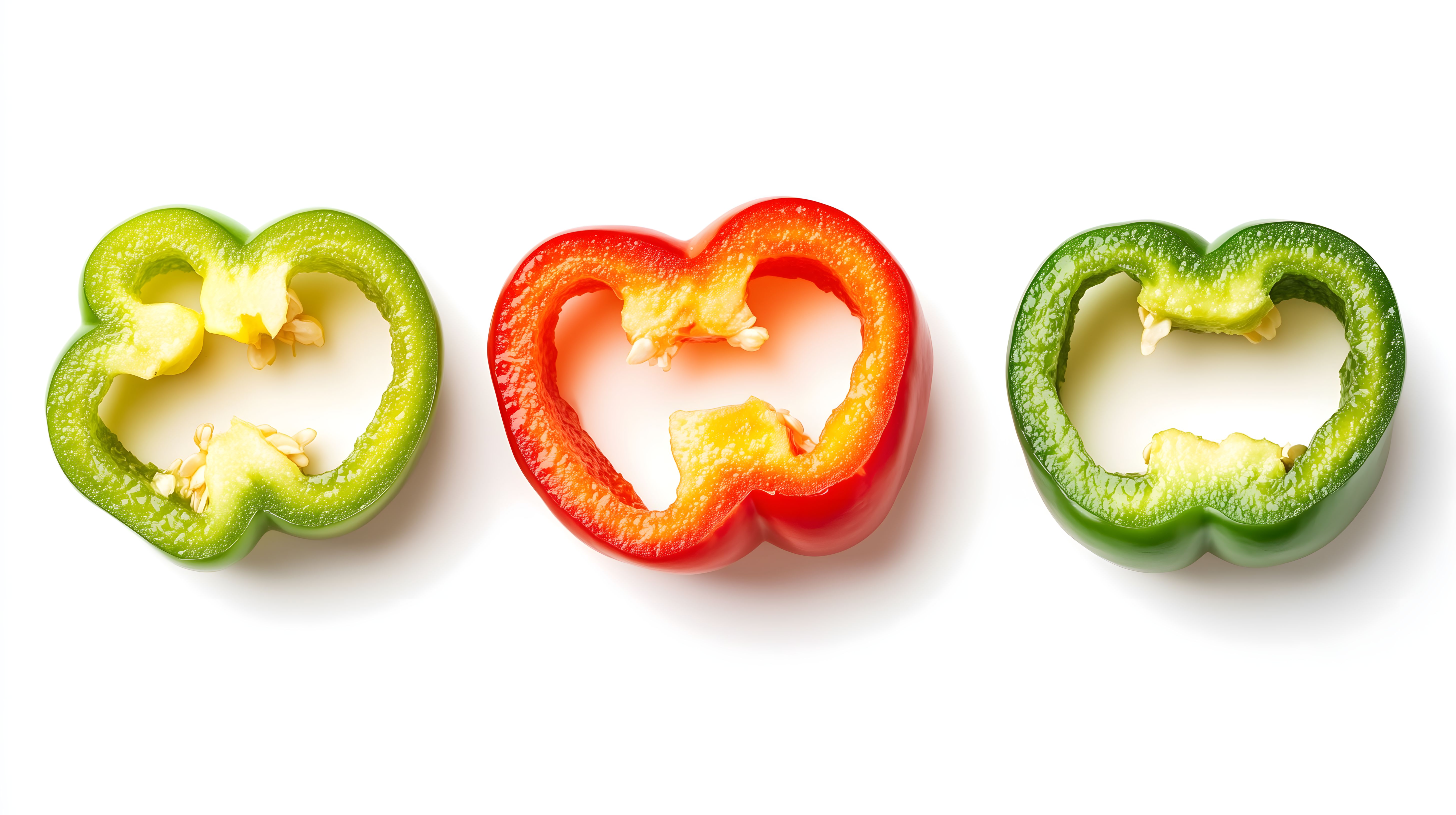 Dieses Stockfoto zeigt drei farbenfrohe Paprikaschnitten in Herzform auf weißem Hintergrund. Die grünen, roten und gelben Paprikahälften sind so angeordnet, dass sie ein appetitliches Herzmotiv ergeben. Das Bild besticht durch seine frischen, lebendigen Farben und die klare, reduzierte Komposition. Es eignet sich hervorragend als kostenloses Stockfoto für Food-Blogs, Ernährungsratgeber, Rezeptsammlungen oder Werbemittel rund um gesunde Ernährung und vegetarische/vegane Küche. Die Auflösung ist hochwertig und kann unter der Creative-Commons-Lizenz frei genutzt werden.