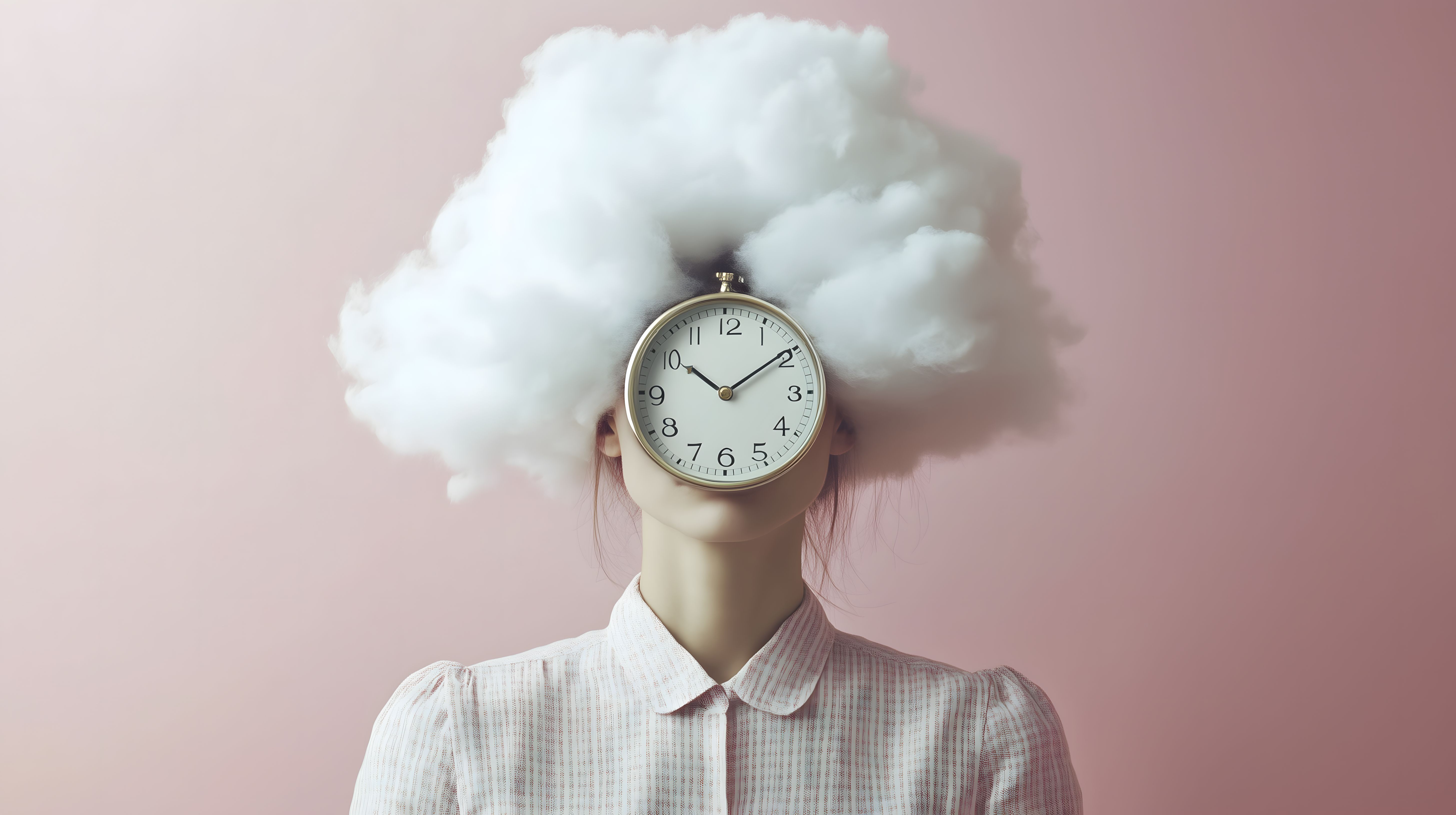 Das Bild zeigt ein surreales Porträt einer jungen Frau, die eine analoge Uhr an Stelle ihres Kopfes trägt. Stattdessen befindet sich eine große, flauschige Wolke über ihren Schultern. Die Frau blickt direkt in die Kamera mit einem nachdenklichen Ausdruck. Der Hintergrund ist in einem sanften Rosa gehalten, was dem Bild eine träumerische und zeitlose Atmosphäre verleiht.