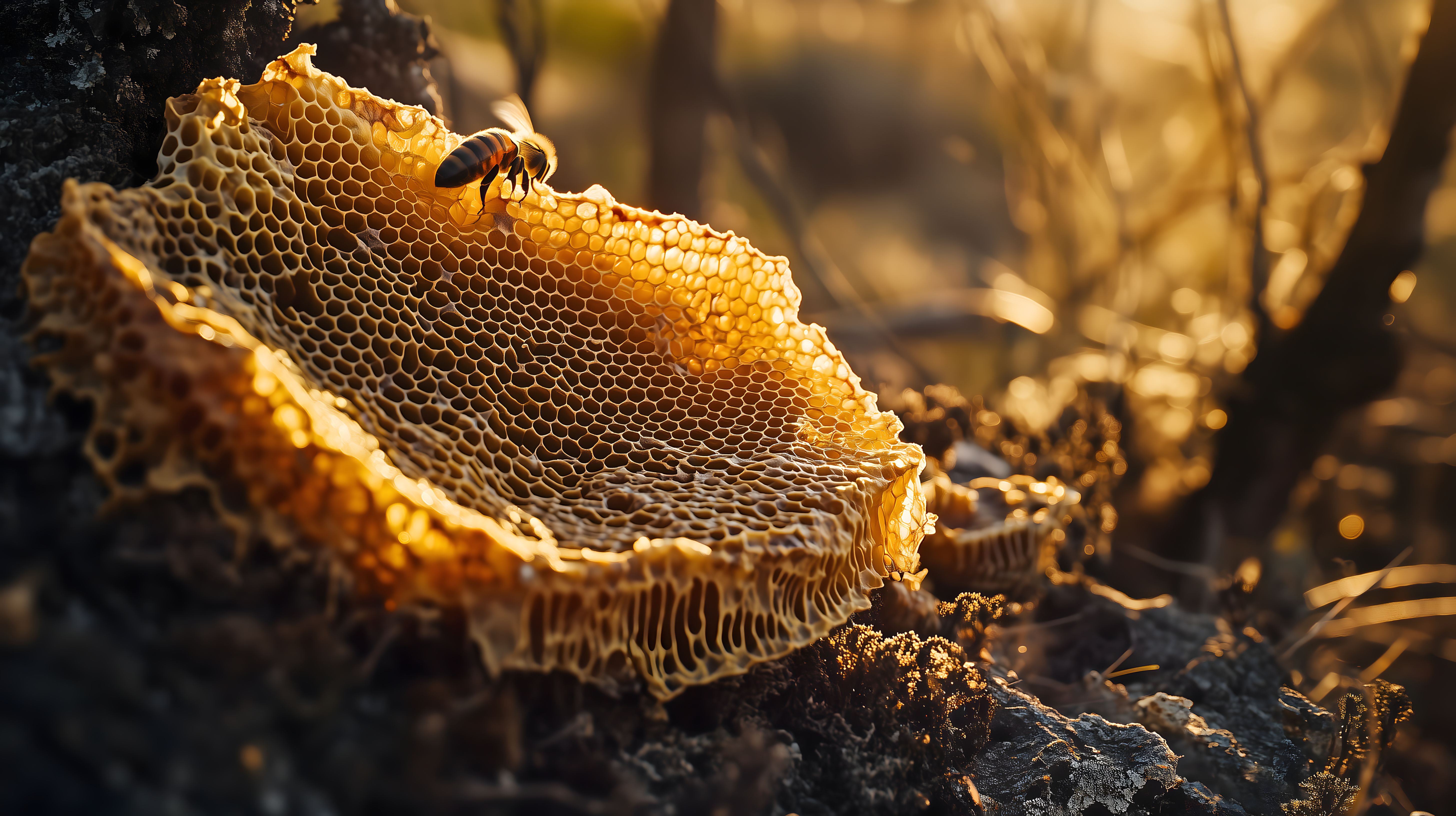 Die detaillierte Aufnahme zeigt eine Bienenwabe in ihrer natürlichen Umgebung. Das goldene Licht, das durch die Blätter fällt, verleiht der Szene eine warme, fast mystische Stimmung. Die Wabe ist von einer dunklen Baumrinde umgeben, was den Kontrast zwischen den leuchtenden, sechseckigen Waben und der rauen Oberfläche des Holzes betont. Eine einzelne Biene ist auf der Wabe zu sehen, was die Verbindung zwischen der Natur und den Insekten, die für die Honigproduktion verantwortlich sind, unterstreicht. Dieses Stockfoto in hoher Auflösung unter Creative-Commons-Lizenz kann für verschiedene Zwecke wie Blogs, Newsletter, Social-Media-Beiträge oder Werbekampagnen genutzt werden.
