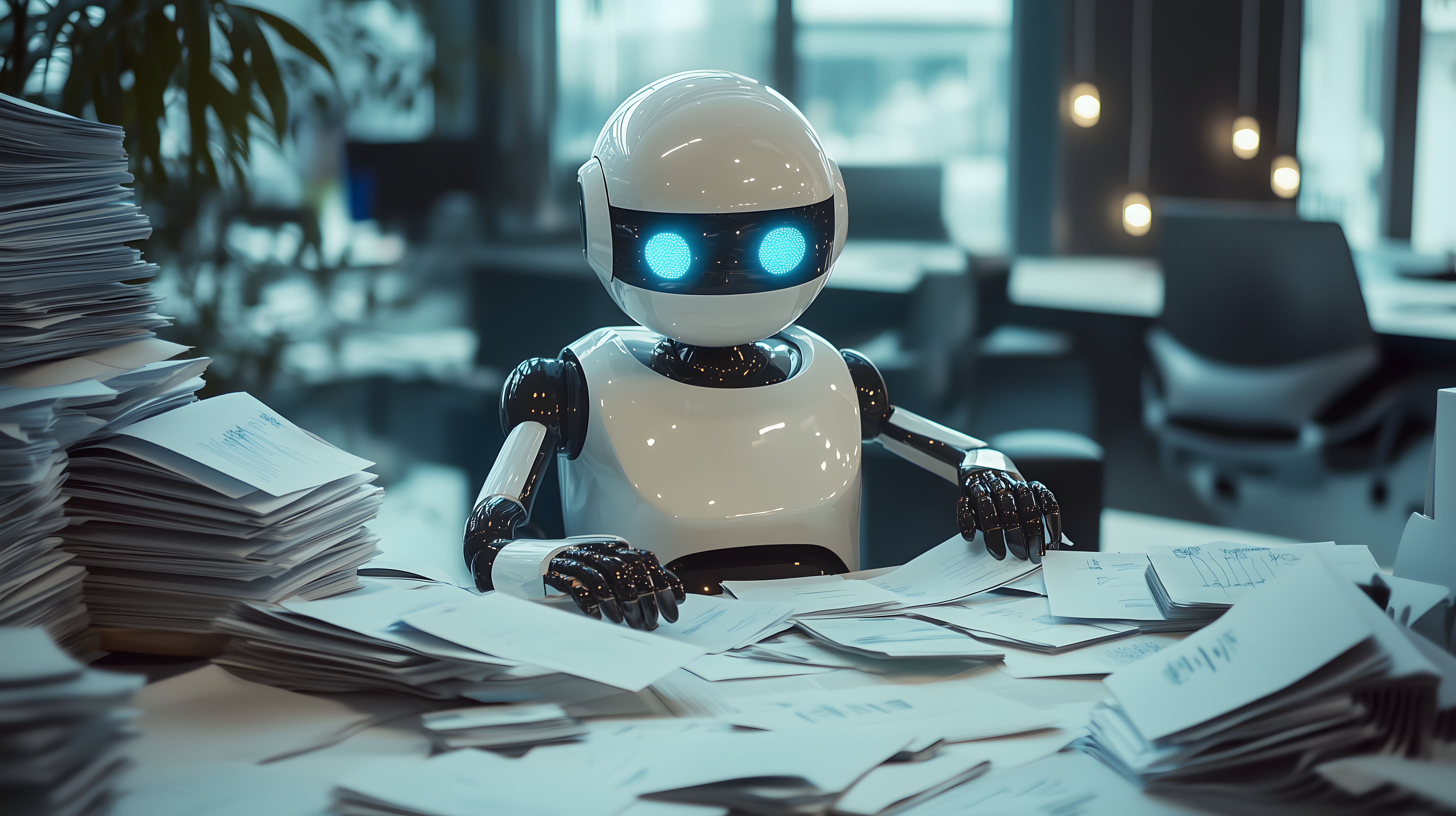 Das Bild zeigt einen Roboter, der an einem überlasteten Schreibtisch sitzt und sich durch einen Stapel von Papieren wühlt. Die Szene ist in einem modern eingerichteten Büroraum mit Fenstern und Beleuchtung dargestellt. Der Roboter hat eine weiße, glatte Oberfläche und leuchtet mit blauen Augen, was ihn technologisch und futuristisch erscheinen lässt. Das Bild vermittelt den Eindruck, dass Roboter in Zukunft möglicherweise immer mehr Aufgaben im Büroalltag übernehmen könnten, um die Effizienz zu steigern und Menschen von manuellen Tätigkeiten zu entlasten.