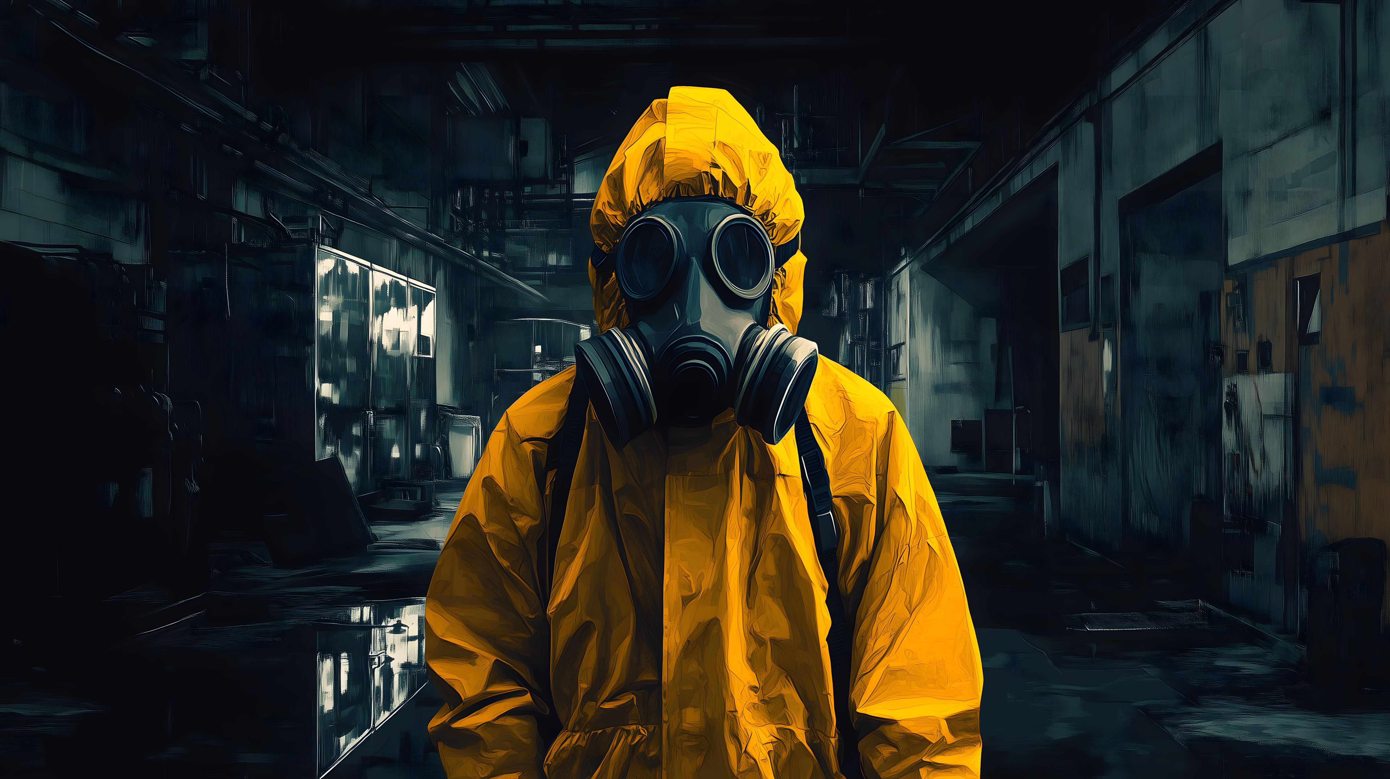 Das Foto zeigt eine Person in einem gelben Schutzanzug, einschließlich Gasmaske, die in einem verlassenen, heruntergekommenen Industriegebäude steht. Die Umgebung ist düster und bedrohlich, mit einer beängstigenden Atmosphäre. Der starke Kontrast zwischen dem leuchtenden Gelb des Anzugs und der dunklen, verwahrlosten Umgebung lässt erahnen, dass es sich hier um eine möglicherweise gefährliche oder katastrophale Situation handelt. Dieses Stockfoto eignet sich hervorragend für Berichte über Umweltverschmutzung, Naturkatastrophen, Krisenkommunikation oder dystopische Themen. Es ist in hoher Auflösung und unter einer Creative-Commons-Lizenz verfügbar.