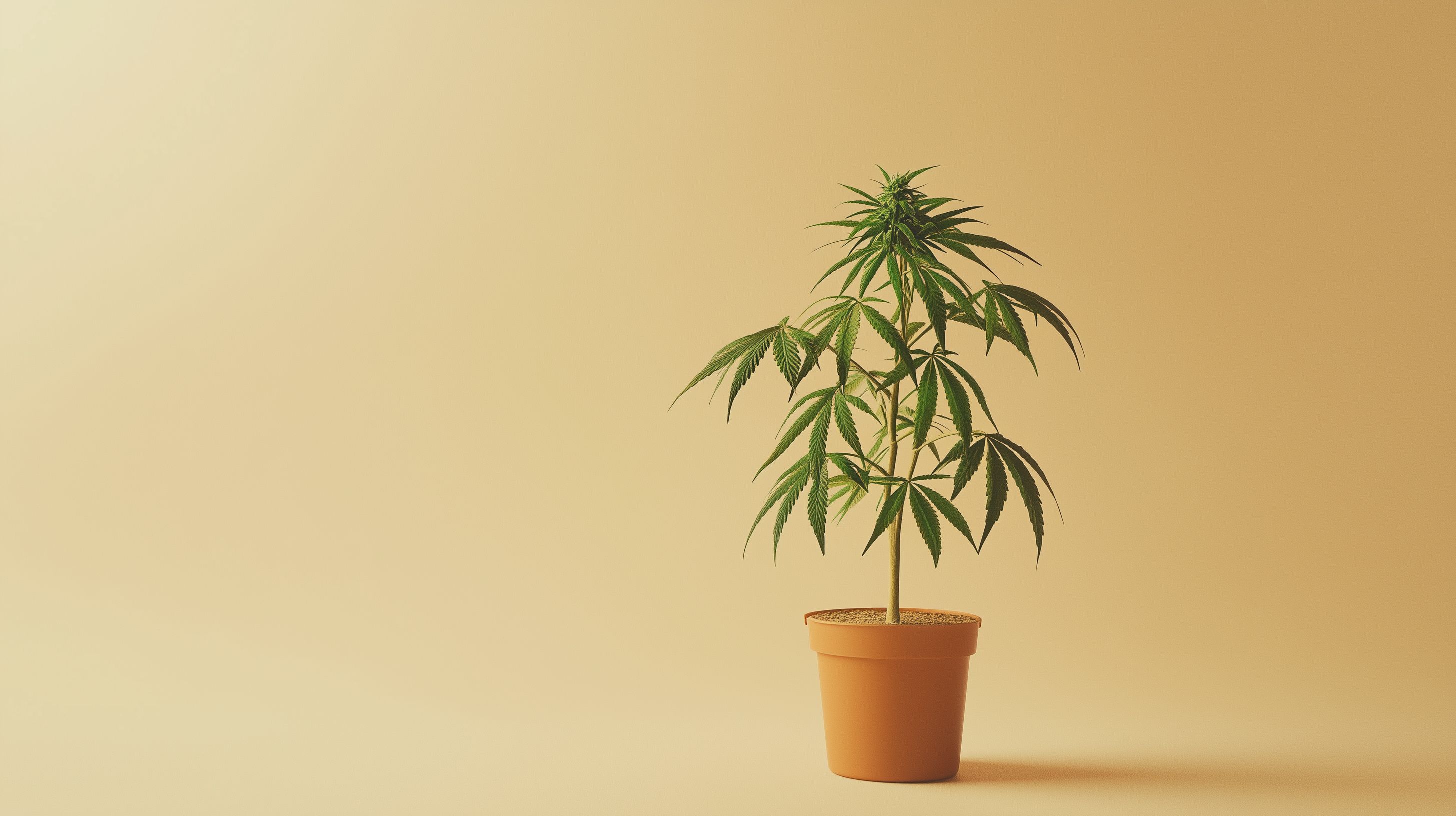 Das Bild zeigt eine grüne Hanfpflanze in einem braunen Tontopf vor einem sandfarbigen Hintergrund. Die Pflanze ist mittig positioniert und nimmt einen Großteil des Bildes ein. Die Blätter sind detailliert und realistisch dargestellt. Der Hintergrund ist einfach und neutral gehalten, wodurch der Fokus ganz auf der Pflanze liegt.