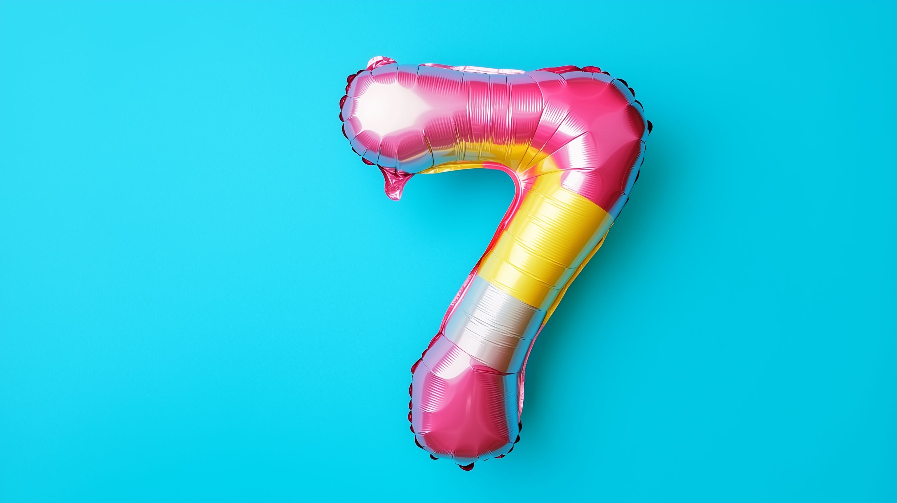 Das Bild zeigt einen auffälligen, farbenfrohen Zahlenballon in der Form der Zahl 7. Der Ballon ist in einer leuchtenden Farbmischung aus Pink, Gelb und Weiß gehalten und hebt sich vor einem intensiv türkisfarbenen Hintergrund ab. Die sommerliche Farbgebung und die Symbolkraft der 7 als Glückszahl machen dieses Motiv ideal für den Einsatz in Geburtstagskarten, Jubiläumseinladungen, Partydekoration oder Werbematerialien zu festlichen Anlässen. Als hochwertiges, kostenloses Stockfoto in hoher Auflösung und unter Creative-Commons-Lizenz ist dieses Bild vielseitig verwendbar.