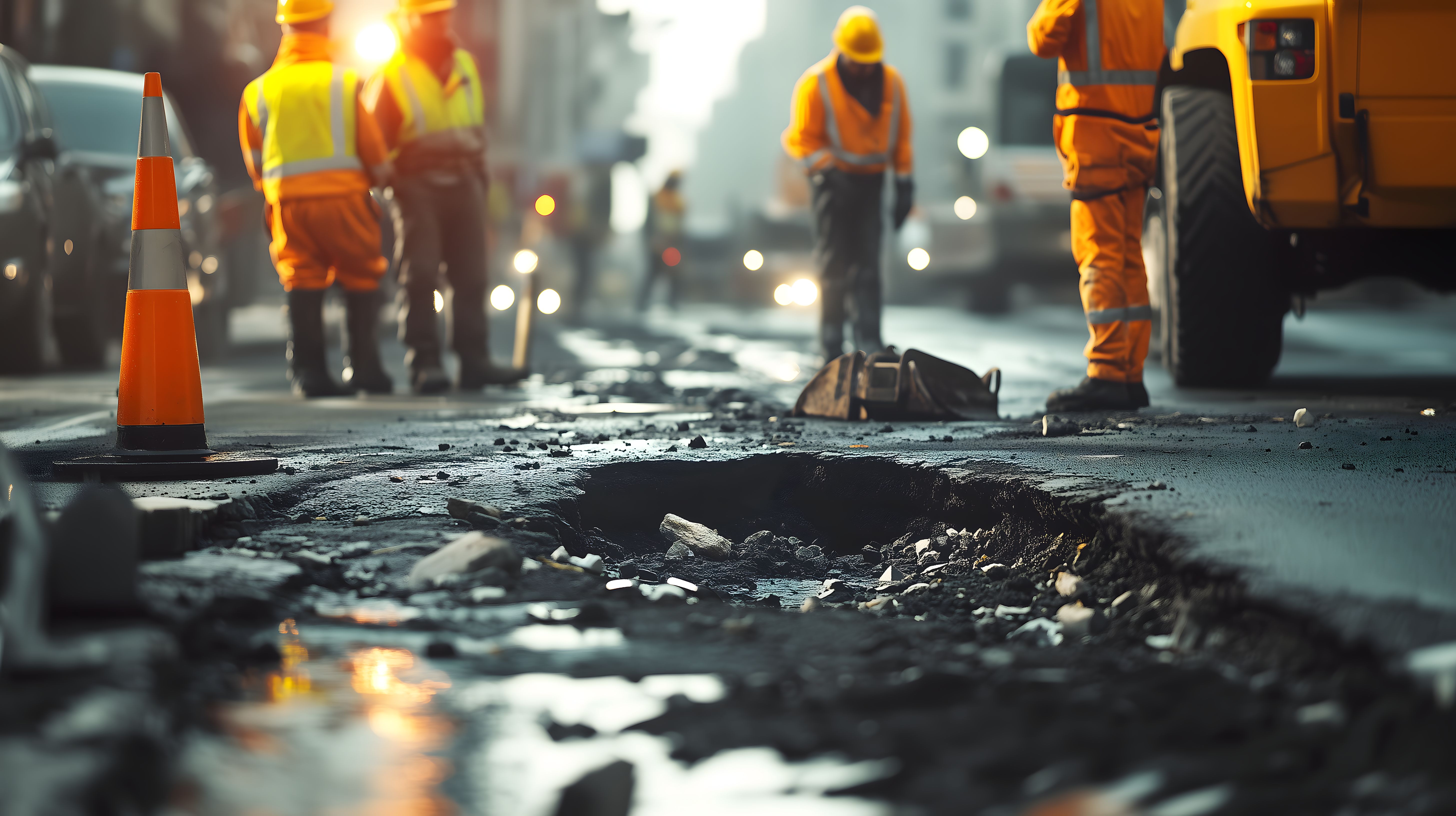 Das Bild zeigt eine Gruppe von Bauarbeitern, die auf einer dunklen, nassen Straße ein Schlagloch inspizieren. Die Arbeiter tragen orangefarbene Warnwesten und Helme, was auf eine aktive Baustelle hinweist. Im Hintergrund sind weitere Verkehrshindernisse wie Kegel und Absperrungen zu sehen. Die Szene wirkt wie eine typische Straßenreparatur-Situation in einer urbanen Umgebung am Abend. Dieses hochauflösende, kostenlose Stockfoto kann in verschiedenen Kontexten wie Blogbeiträgen, Newslettern oder Social-Media-Posts zum Thema Bauarbeiten, Infrastruktur oder Stadtleben verwendet werden und steht unter einer Creative-Commons-Lizenz zur Verfügung.