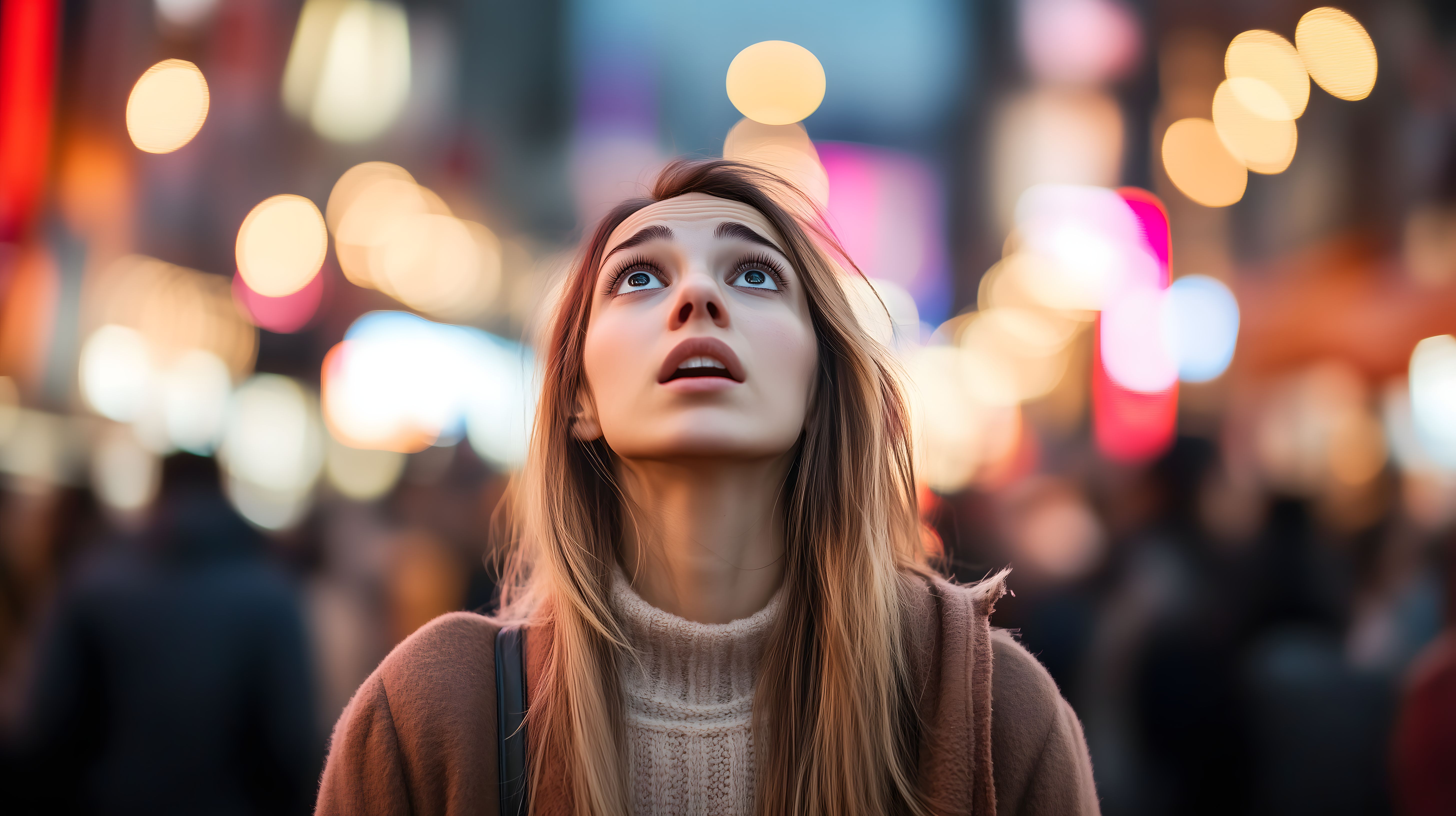 Das Bild zeigt eine junge Frau, die inmitten einer belebten Großstadt-Szenerie steht. Sie blickt fasziniert und verwundert nach oben, umgeben von bunten Lichteffekten und einer stimmungsvollen, urbanen Atmosphäre. Das Foto vermittelt eine Mischung aus Großstadtflair, Emotion und Modernität. Es eignet sich perfekt als kostenloses Stockfoto für Blog-Beiträge, Newsletter, Social-Media-Kanäle oder Werbematerialien in hoher Auflösung und unter Creative-Commons-Lizenz.