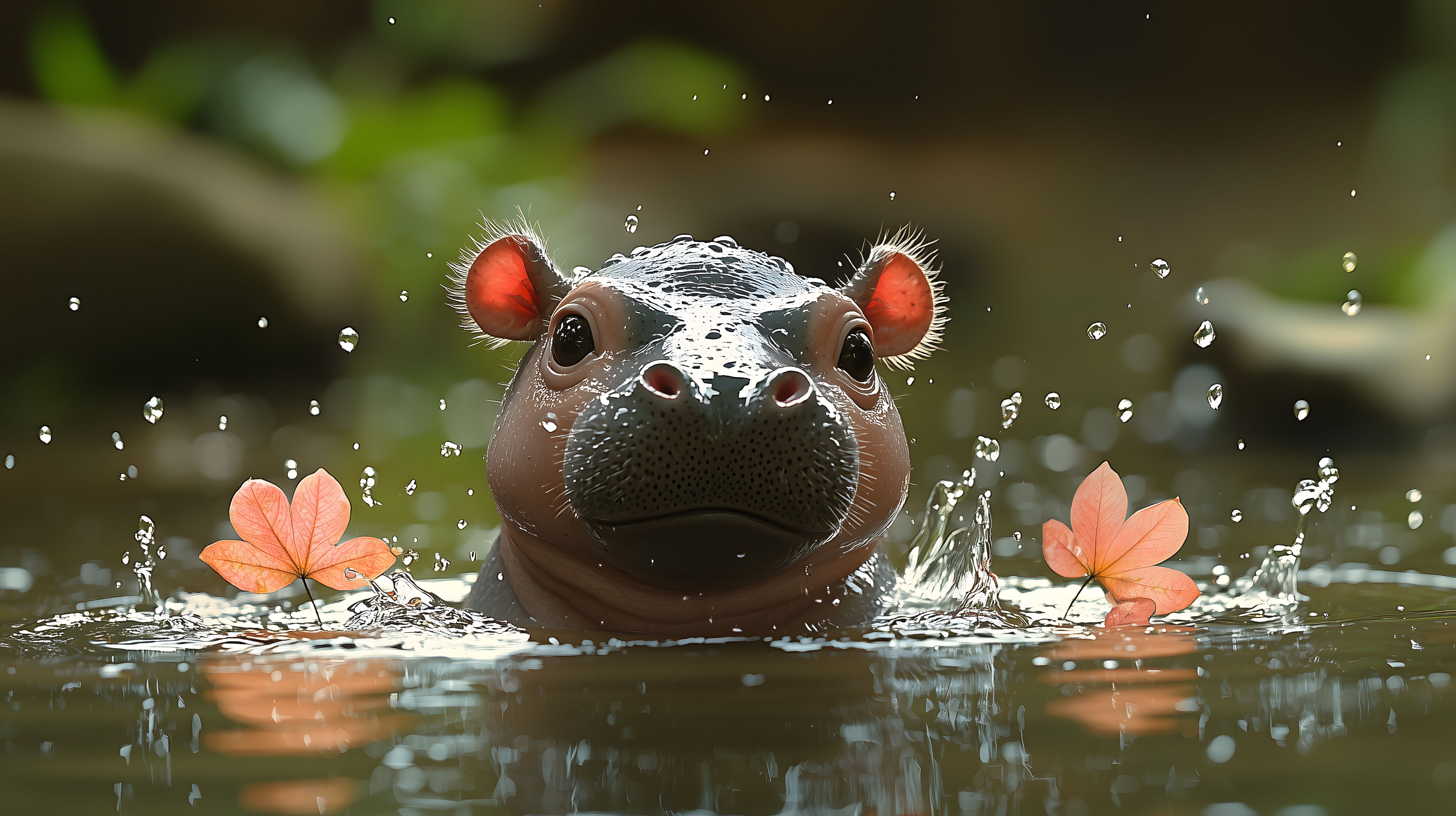 Das Bild zeigt ein niedliches, junges Flusspferd, das in einem Gewässer mit Herbstlaub badet. Das Flusspferd ist nur bis zum Hals zu sehen und blickt direkt in die Kamera. Das Wasser spritzt um das Tier herum, was den Eindruck einer spritzenden, lebendigen Unterwasserwelt vermittelt. Die roten Ohren und der freche Gesichtsausdruck verleihen dem Flusspferd einen verspielten, charmanten Charakter. Diese außergewöhnliche Aufnahme könnte sich ideal für die Verwendung in Blogbeiträgen, Newslettern oder als faszinierenden Eyecatcher in Werbekampagnen eignen. Dieses hochauflösende, kostenlose Stockfoto unter Creative-Commons-Lizenz ist eine wunderbare Ressource für Kreative und Marketer.