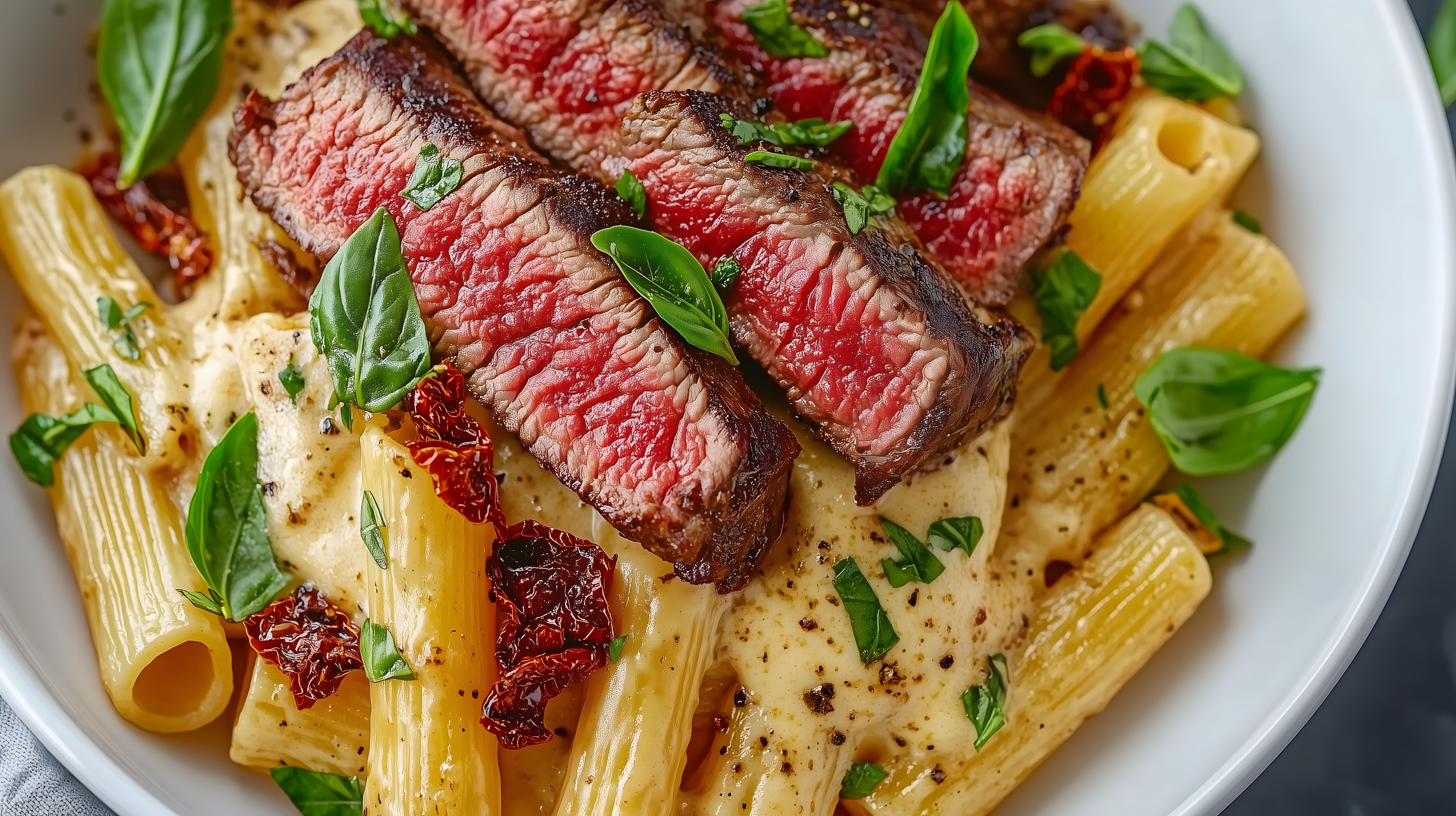 Dieses appetitliche Bild zeigt ein Gericht aus saftigem, rosa gegarten Steak und cremigen, al dente gekochten Nudeln. Die Pasta ist mit frischen Basilikumblättern, getrockneten Tomaten und einer kräftigen Würzsauce angerichtet. Das Arrangement auf dem tiefen weißen Teller vermittelt eine rustikale, aber hochwertige Optik. Dieses Stockfoto eignet sich hervorragend für Blogs, Newsletter, Social-Media-Beiträge und andere kulinarische Werbeanwendungen in hoher Auflösung und unter der kostenlosen Creative-Commons-Lizenz.