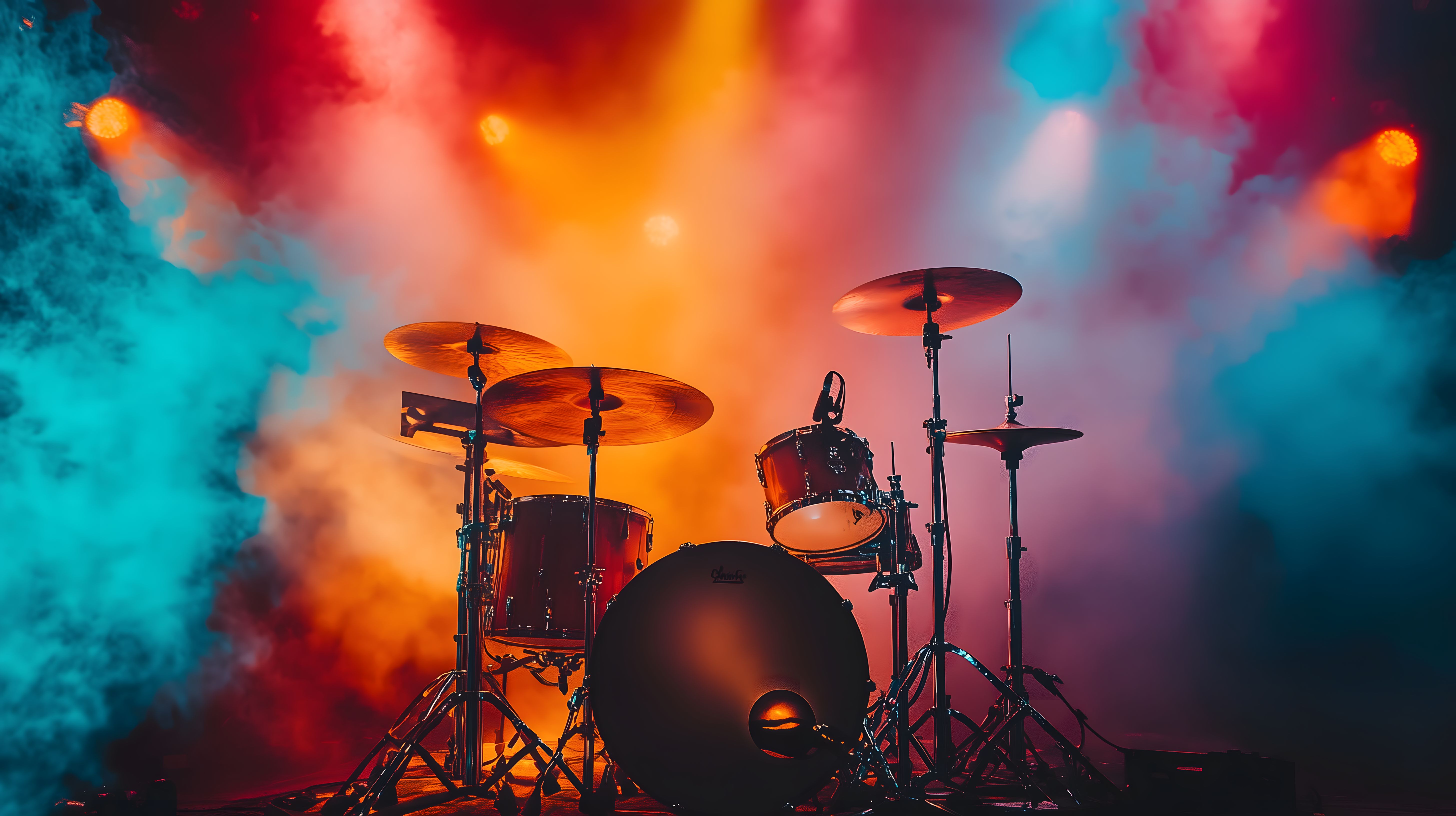 Das Bild zeigt eine dynamische Schlagzeugaufnahme auf der Bühne. Die Trommeln und Becken sind vor einem Hintergrund aus buntem, dramatischem Bühnenlicht und Nebeleffekten zu sehen. Die Farben reichen von kräftigem Orange über Rot und Blau bis hin zu einem leichten Türkiston. Dieser Kontrast und die Bewegung der Elemente verleihen dem Bild eine starke Energie und Spannung. Es eignet sich hervorragend als kostenloses Stockfoto für Blog-Beiträge, Newsletter oder Social-Media-Kanäle rund um die Themen Musik, Konzerte, Kreativität und Liveperformance. Die Auflösung ist hochwertig und das Bild kann unter einer Creative-Commons-Lizenz genutzt werden.