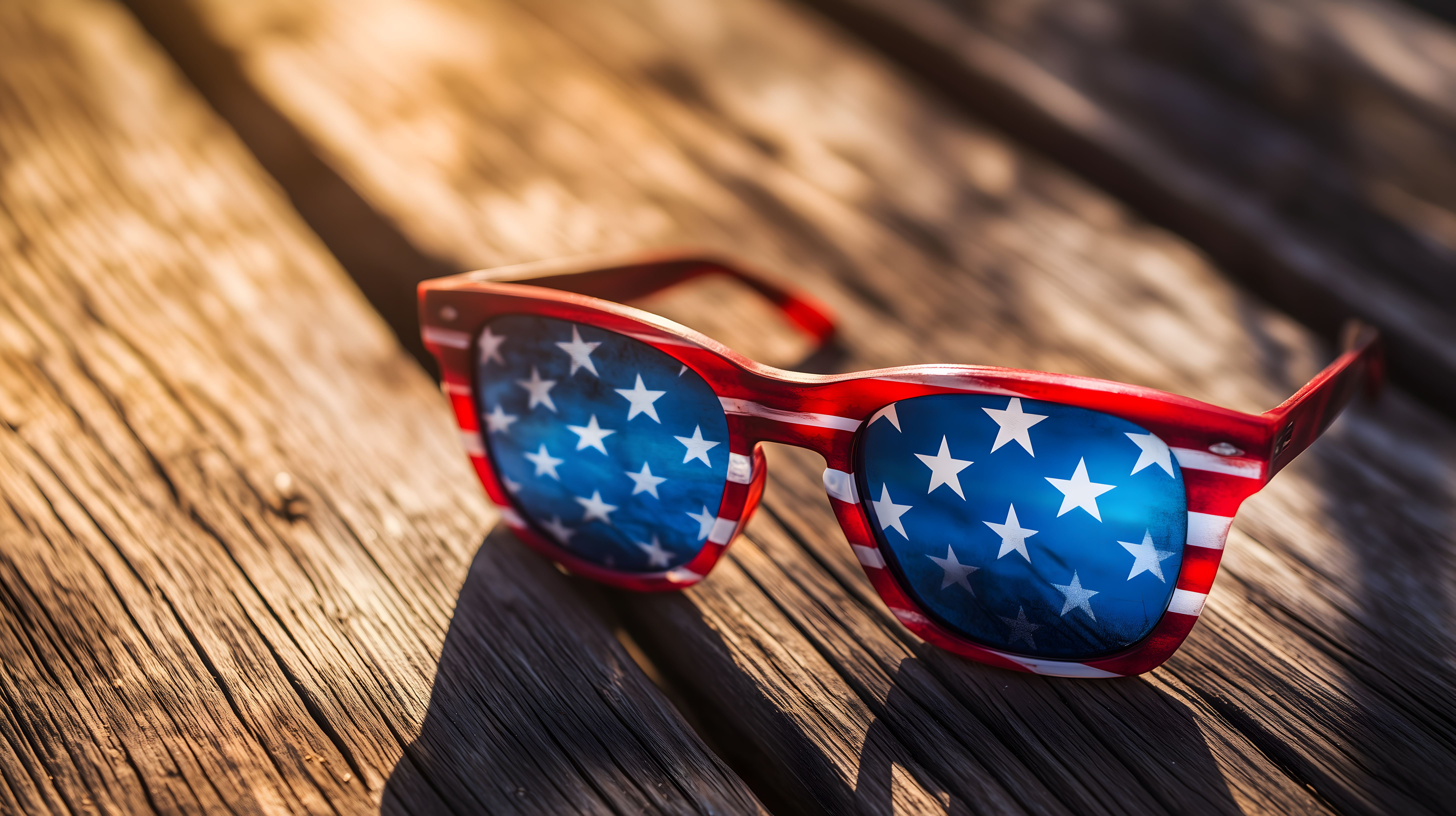Das Bild zeigt eine Sonnenbrille in den Farben der amerikanischen Flagge, die auf einem rustikalen Holztisch liegt. Die Brille hat einen auffälligen Rahmen in Rot-Weiß-Blau mit Sternen, die an die Sterne und Streifen der US-Flagge erinnern. Der Holztisch im Hintergrund hat eine natürliche, grobe Holzstruktur, die einen schönen Kontrast zum modernen Brillendesign bildet. Dieses Foto wäre ideal für den Einsatz in Blogbeiträgen, Newsletter-Designs oder Social-Media-Posts, die ein amerikanisches, patriotisches oder sommerliches Thema aufgreifen. Als hochwertiges, kostenloses Stockfoto unter Creative-Commons-Lizenz ist es flexibel einsetzbar.