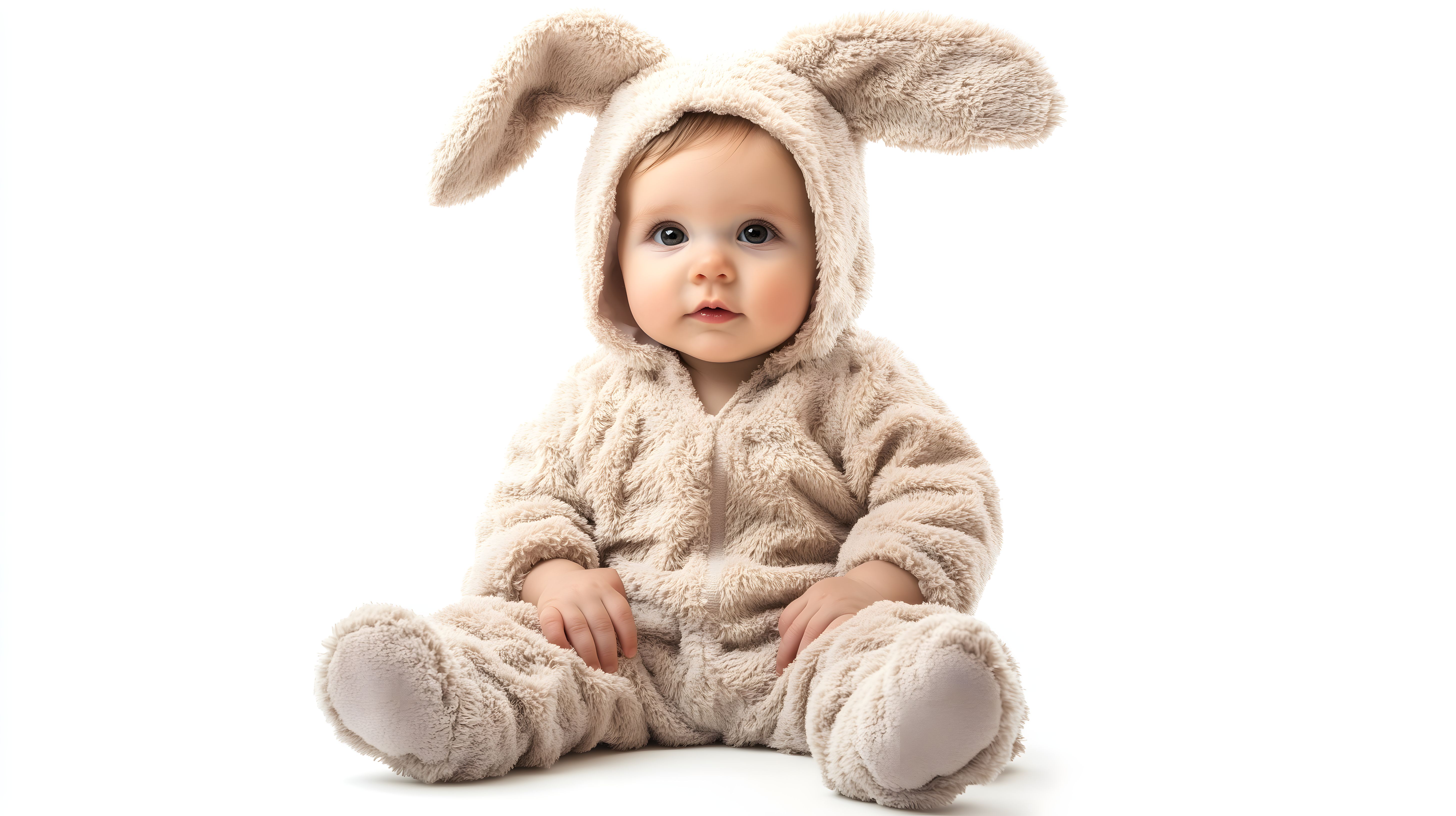 Das Bild zeigt ein entzückendes Kleinkind, das in ein flauschiges Hasenkostüm gekleidet ist. Das Baby sitzt auf einem weißen Hintergrund und hat einen verträumten, charmanten Ausdruck auf dem Gesicht. Das weiche, beige Kostüm mit den charakteristischen Hasenohren verleiht dem Kind einen verspielten und niedlichen Look. Dieses hochwertige Stockfoto eignet sich perfekt für verschiedenste Verwendungszwecke, wie etwa Werbeanzeigen, Social-Media-Posts, Kindermode-Kataloge oder Grußkarten. Die hochauflösende Aufnahme mit natürlicher Beleuchtung und scharfen Details ist unter einer kostenlosen Creative-Commons-Lizenz verfügbar und kann frei genutzt werden.