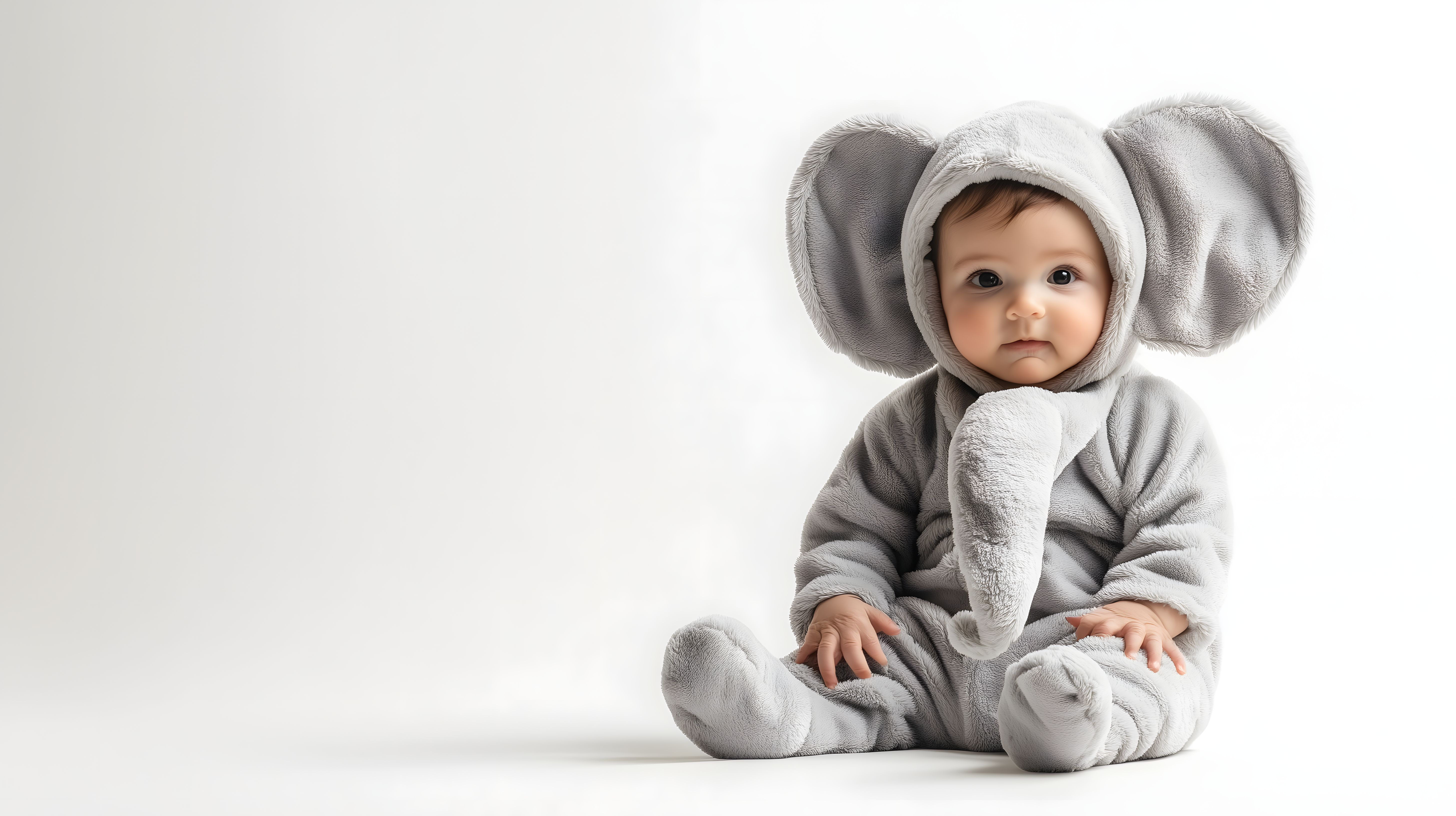 Dieses entzückende Bild zeigt ein Baby, das in ein flauschiges Elefantenkostüm gekleidet ist. Das Kind sitzt friedlich auf einem weißen Hintergrund und lächelt freundlich in die Kamera. Die grauen Töne des Kostüms bilden einen schönen Kontrast zu der einfachen, hellen Umgebung. Dieses Stockfoto eignet sich hervorragend für den Einsatz in Blogbeiträgen, Newslettern, auf Social-Media-Kanälen oder in Werbematerialien, die ein süßes, einzigartiges Baby-Motiv benötigen. Das hochauflösende Bild steht unter der Creative-Commons-Lizenz kostenlos zum Download bereit.