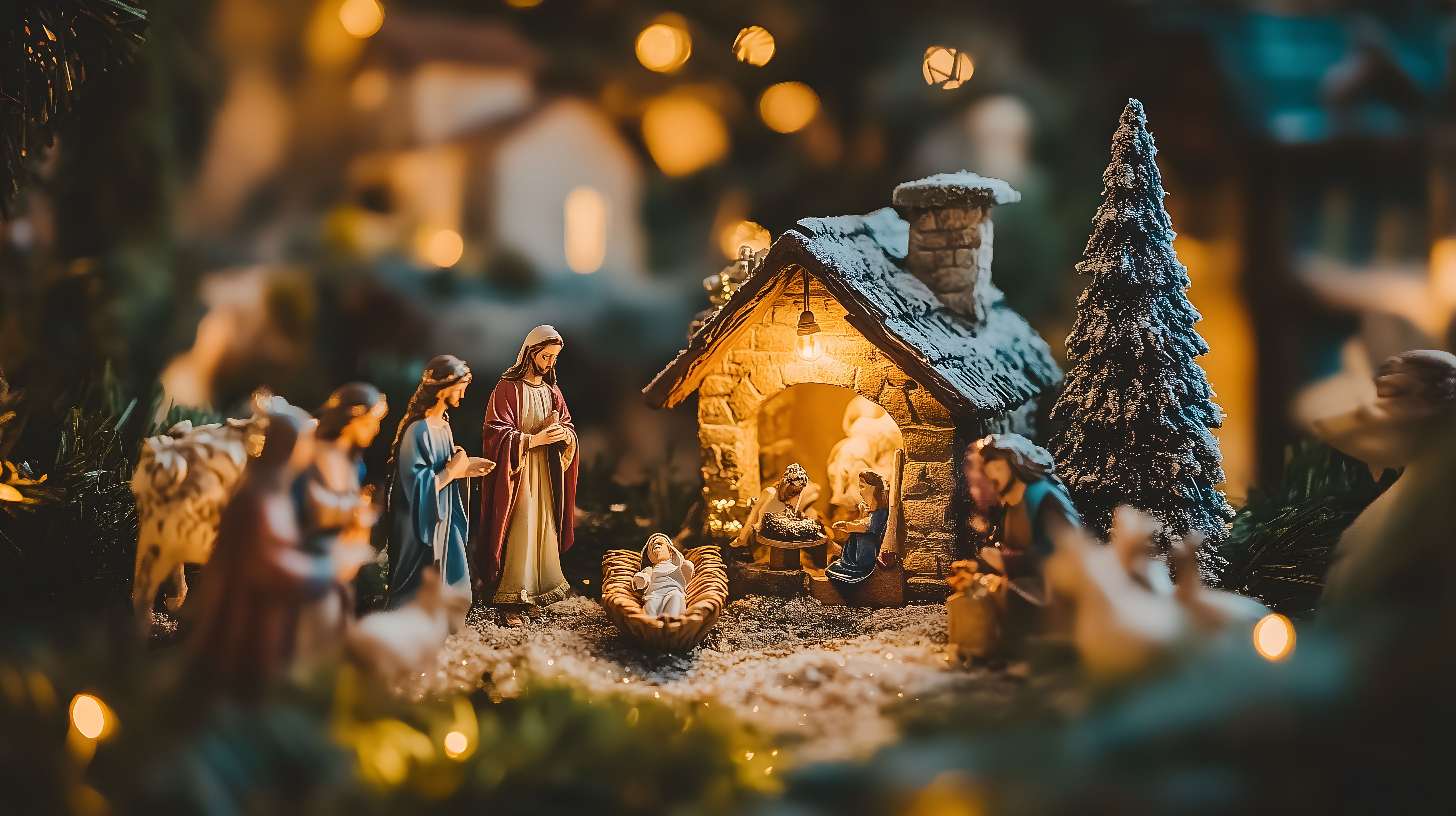 Dieses stimmungsvolle Weihnachtsfoto zeigt eine detailreich gestaltete Weihnachtskrippe mit einer beleuchteten Hütte, umgeben von Schnee und Weihnachtsbäumen. Die Figuren der Heiligen Familie sowie weiterer Personen sind liebevoll dargestellt und verleihen der Szene eine besinnliche, traditionelle Atmosphäre. Das Foto eignet sich hervorragend als Hintergrundbild für Weihnachtsgrüße, Printmedien oder Social-Media-Beiträge rund um die Weihnachtszeit. Es ist in hoher Auflösung und unter einer Creative-Commons-Lizenz verfügbar.