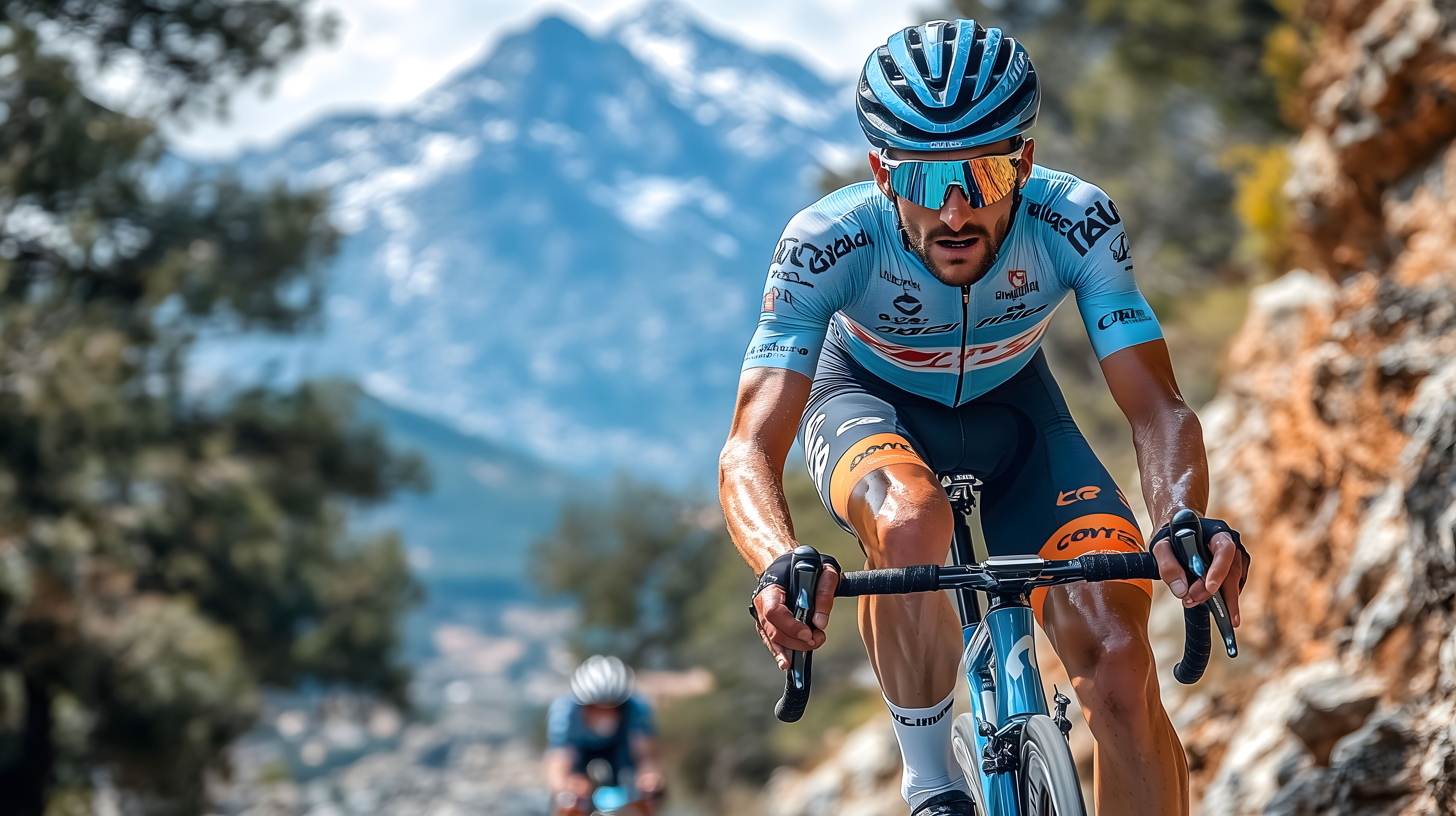 Das Foto zeigt einen Radrennsportler, der eine steile Bergstrecke in einer alpinen Landschaft hinauffährt. Der Fahrer ist in voller Aktion und Konzentration zu sehen, wie er mit seinem Rennrad die anstrengende Steigung meistert. Im Hintergrund sind schneebedeckte Berggipfel und eine malerische Naturkulisse zu erkennen, die dem Bild eine dramatische und athletische Anmutung verleihen. Dieses Stockfoto eignet sich hervorragend für Beiträge zu Themen wie Outdoor-Sport, Wettbewerb, Fitness oder Ausdauertraining. Es ist in hoher Auflösung verfügbar und kann unter der Creative-Commons-Lizenz kostenfrei genutzt werden.