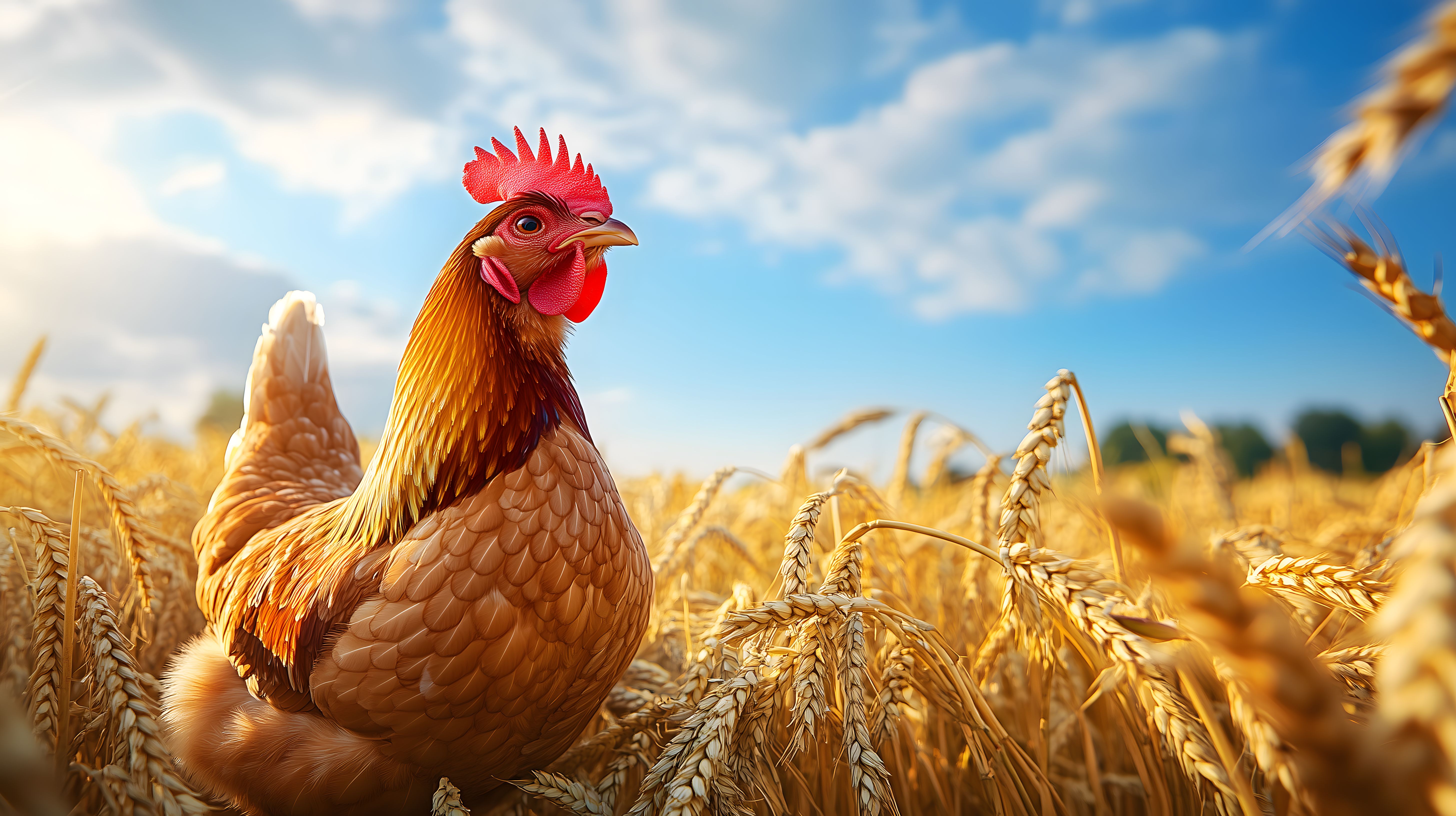 Dieses eindrucksvolle Foto zeigt einen stattlichen Hahn, der stolz in einem goldenen Weizenfeld steht. Der bunte Vogel kontrastiert wirkungsvoll mit den reichen Ähren, die im Sonnenlicht leuchten. Die idyllische Landschaftsszene strahlt eine friedliche, ländliche Atmosphäre aus und lässt den Betrachter für einen Moment in die Natur eintauchen.