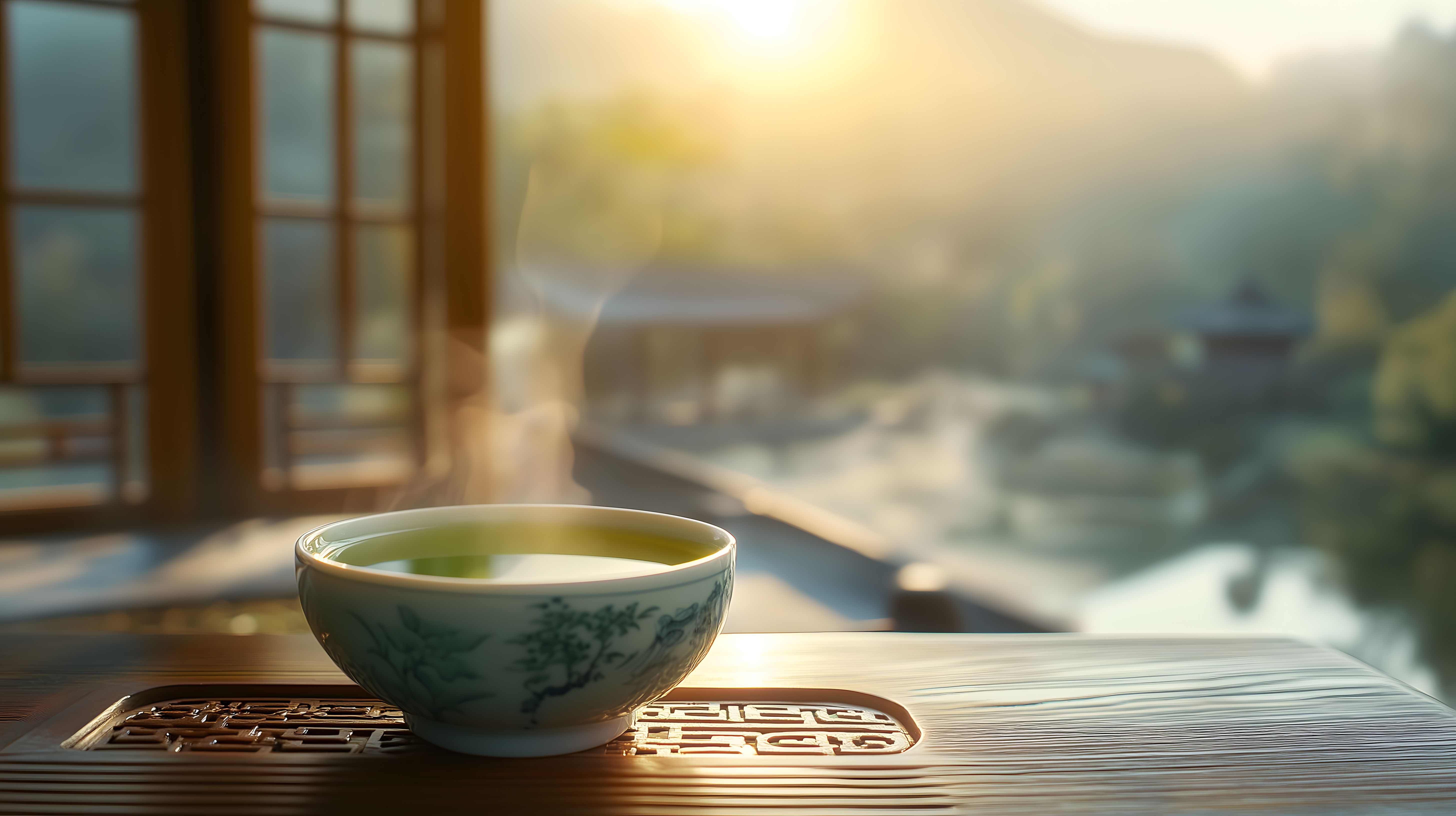 Das Foto zeigt eine Tasse grünen Tee auf einer traditionellen chinesischen Veranda im Morgenlicht. Die Szene ist von einer gemütlichen, friedlichen Stimmung geprägt - der Betrachter kann die Ruhe und Entspannung fast spüren. Im Hintergrund ist eine idyllische Landschaftsansicht zu sehen, die den Eindruck von Harmonie und Naturnähe verstärkt. Dieses kostenlose, hochauflösende Stockfoto mit Creative-Commons-Lizenz eignet sich hervorragend für Blogbeiträge, Newsletter-Designs oder Social-Media-Posts rund um Themen wie asiatische Kultur, Teezeremonie, Meditation oder den Start in den Tag. Die warmen Farben und die detailreiche Komposition machen das Bild zu einem echten Blickfang.