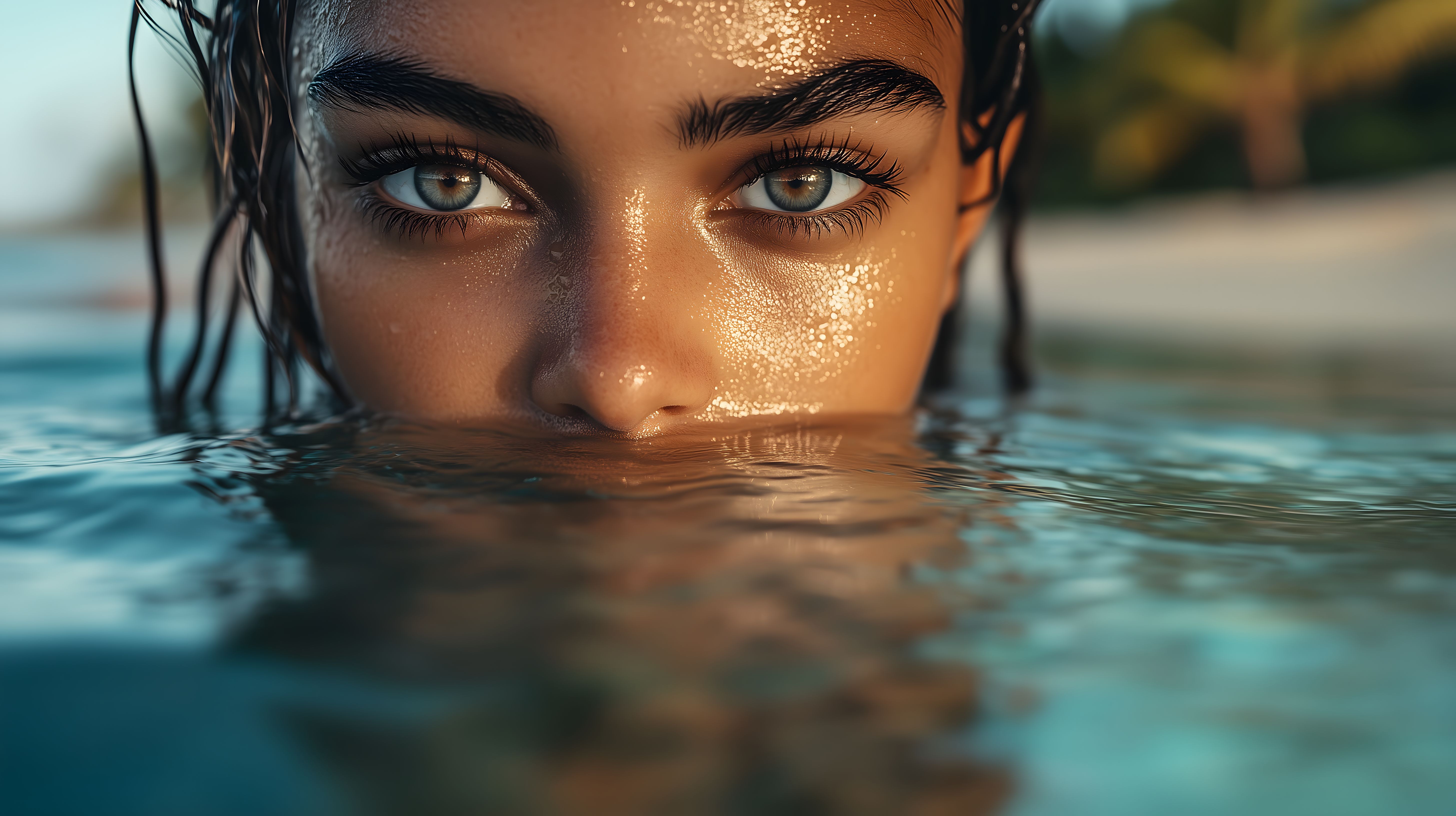 Dieses eindrucksvolle Porträtfoto zeigt eine Frau, die gerade aus dem türkisfarbenen Gewässer auftaucht. Ihre Haare sind nass und glänzen in der Sonne, während ihre strahlenden Augen direkt in die Kamera blicken. Die Nahaufnahme und der scharfe Fokus auf das Gesicht der Frau verleihen dem Bild eine intime und fesselnde Ausstrahlung. Es eignet sich hervorragend als kostenloses Stockfoto für Artikel, Werbematerialien oder Social-Media-Beiträge rund um Themen wie Schönheit, Reisen, Wellness und Lifestyle in hoher Auflösung unter Creative-Commons-Lizenz.