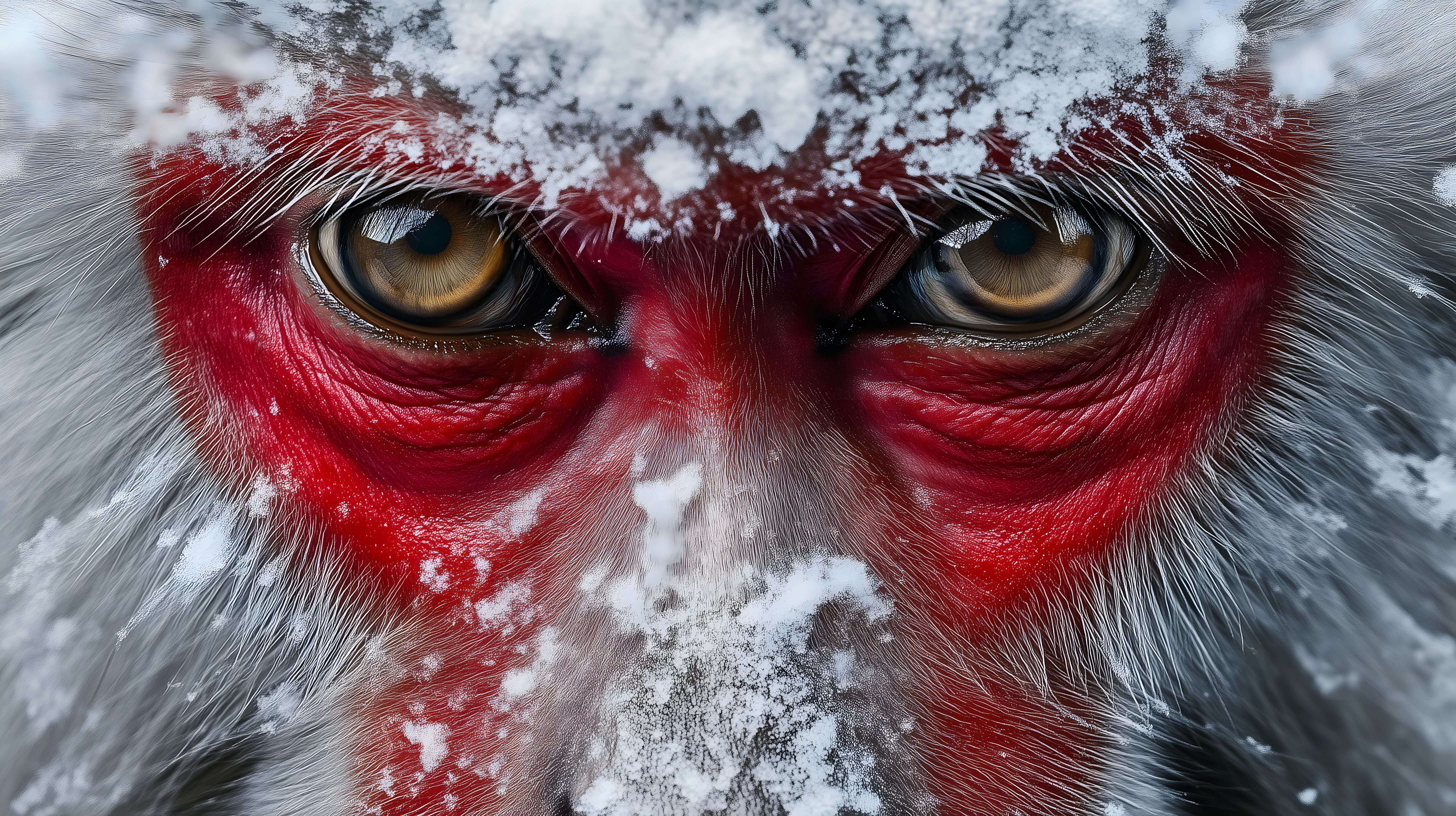 Diese faszinierende Nahaufnahme zeigt das Gesicht eines japanischen Makaken, der tief verschneit ist. Die kräftig roten Hautpartien um die Augen und die Nase stechen besonders hervor und verleihen dem Gesichtsausdruck einen intensiven und fast menschlichen Ausdruck. Die stechenden Augen des Affen blicken den Betrachter direkt an und lassen eine gewisse Erhabenheit und Würde erkennen. Das Fell des Makaken ist mit feinen Schneekristallen überzogen, was dem Bild eine winterliche Stimmung verleiht.