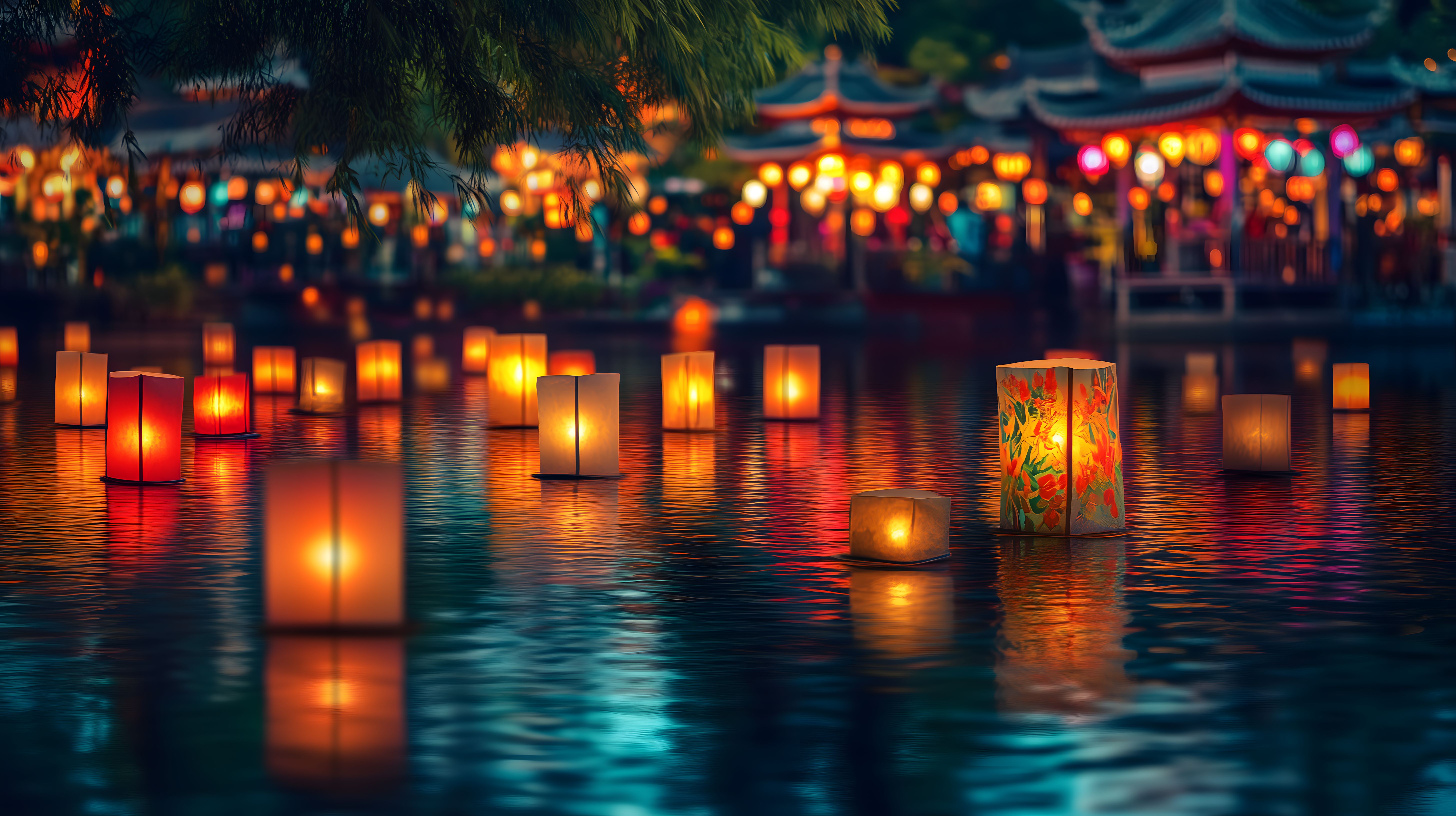 Dieses stimmungsvolle Foto zeigt eine romantische Szene mit schwimmenden, leuchtenden Laternen auf einem ruhigen Wasserspiegel bei Nacht. Die Laternen sind in verschiedenen Farben erleuchtet und spiegeln sich im Wasser wider, was eine friedliche und meditative Atmosphäre schafft. Der Hintergrund ist dunkel, was den Fokus auf die Laternen lenkt und eine geheimnisvolle Stimmung erzeugt. Dieses Bild eignet sich hervorragend für den Einsatz in Blogs, Newslettern, Social-Media-Beiträgen oder Werbematerial, zum Beispiel für Produkte oder Dienstleistungen mit asiatischem Flair oder im Bereich Entspannung und Meditation. Als hochauflösendes, kostenloses Stockfoto unter Creative-Commons-Lizenz ist es frei nutzbar.