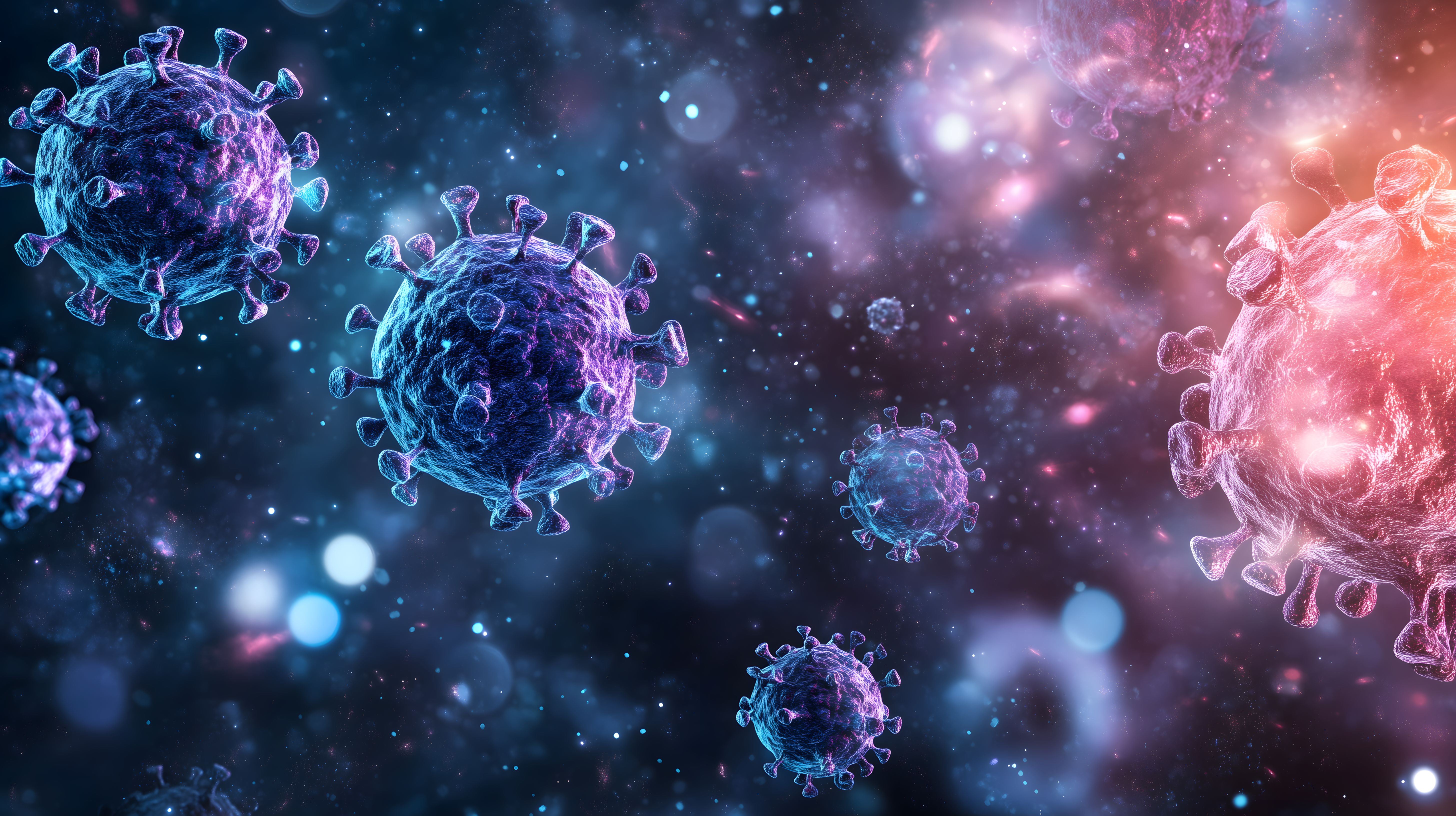 Dieses Bild zeigt eine bunte, künstlerische Illustration von Coronaviren, die in einem kosmischen Hintergrund mit Nebula, Sternen und anderen Galaxien schweben. Die violetten, blauen und roten Viren sind detailliert dargestellt und heben sich vom dunklen Weltraummotiv ab. Diese faszinierende Visualisierung eignet sich hervorragend als Hintergrundbild oder Gestaltungselement für Blogs, Newsletter, Social-Media-Beiträge und Werbematerialien rund um das Thema Coronavirus, Pandemie und Wissenschaft. Das hochauflösende, kostenlose Stockfoto ist unter der Creative-Commons-Lizenz verfügbar.
