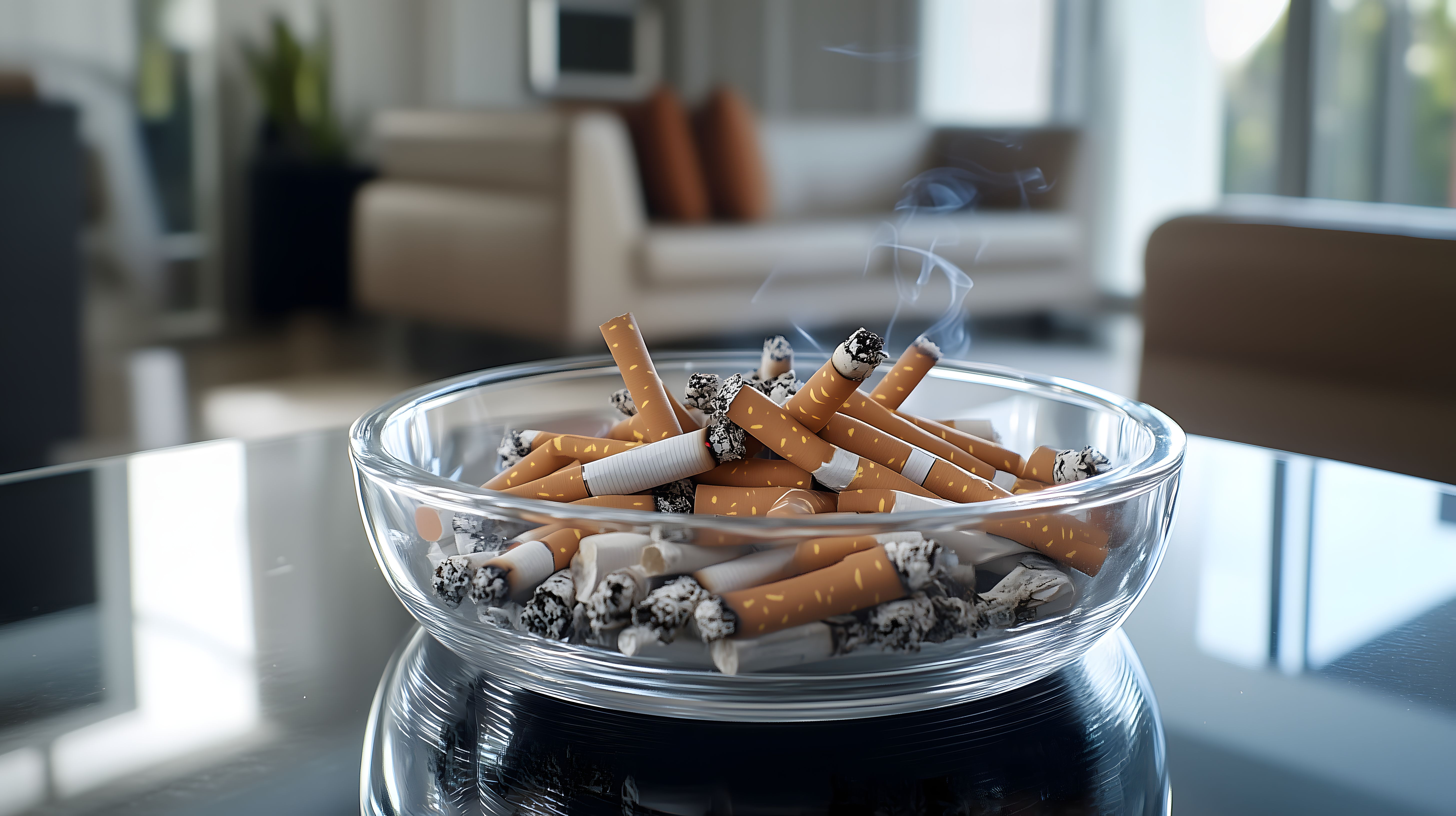 Das Bild zeigt einen transparenten Aschenbecher, in dem sich mehrere brennende Zigarettenstummel befinden. Der Aschenbecher steht auf einem modernen Holztisch, umgeben von einer gemütlichen Wohnumgebung mit Sofa, Kissen und großen Fenstern, die natürliches Tageslicht einlassen. Der Rauch steigt von den Zigaretten auf, was eine atmosphärische Stimmung erzeugt. Dieses Stockfoto eignet sich beispielsweise für Beiträge in Blogs, Newsletter oder Social-Media-Kanälen zum Thema Rauchen, Gesundheitsrisiken oder den Wandel moderner Lebensstile. Es ist in hoher Auflösung und unter einer Creative-Commons-Lizenz frei verfügbar.