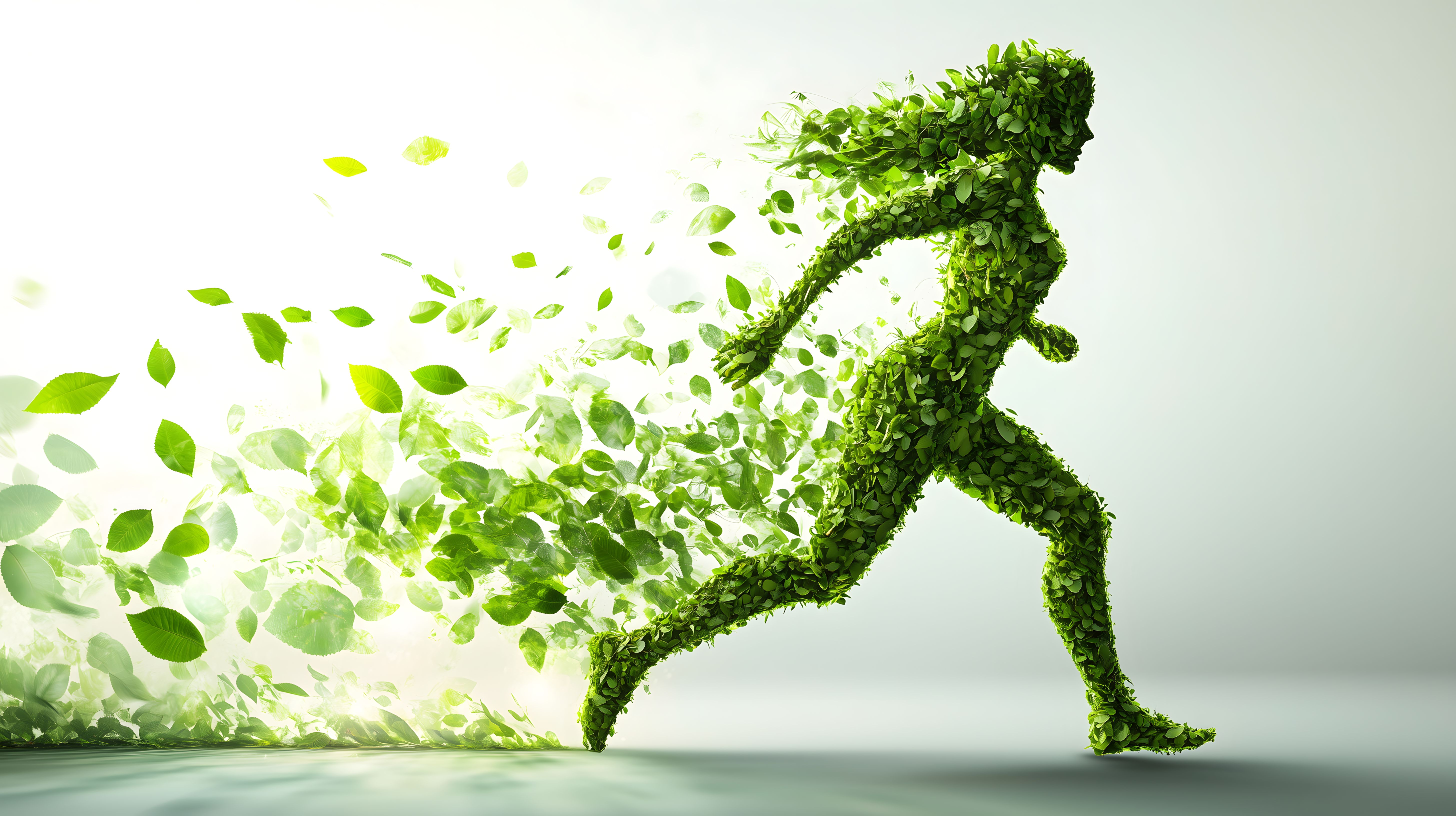 Dieses Foto zeigt eine menschliche Figur, die aus grünen Blättern erschaffen wurde und dynamisch läuft. Die Komposition vermittelt den Eindruck von Bewegung, Vitalität und Nachhaltigkeit. Die Darstellung eines Laufenden Wesens aus natürlichen Elementen symbolisiert den Einklang zwischen Mensch und Natur sowie den Einsatz für eine umweltfreundlichere Lebensweise.