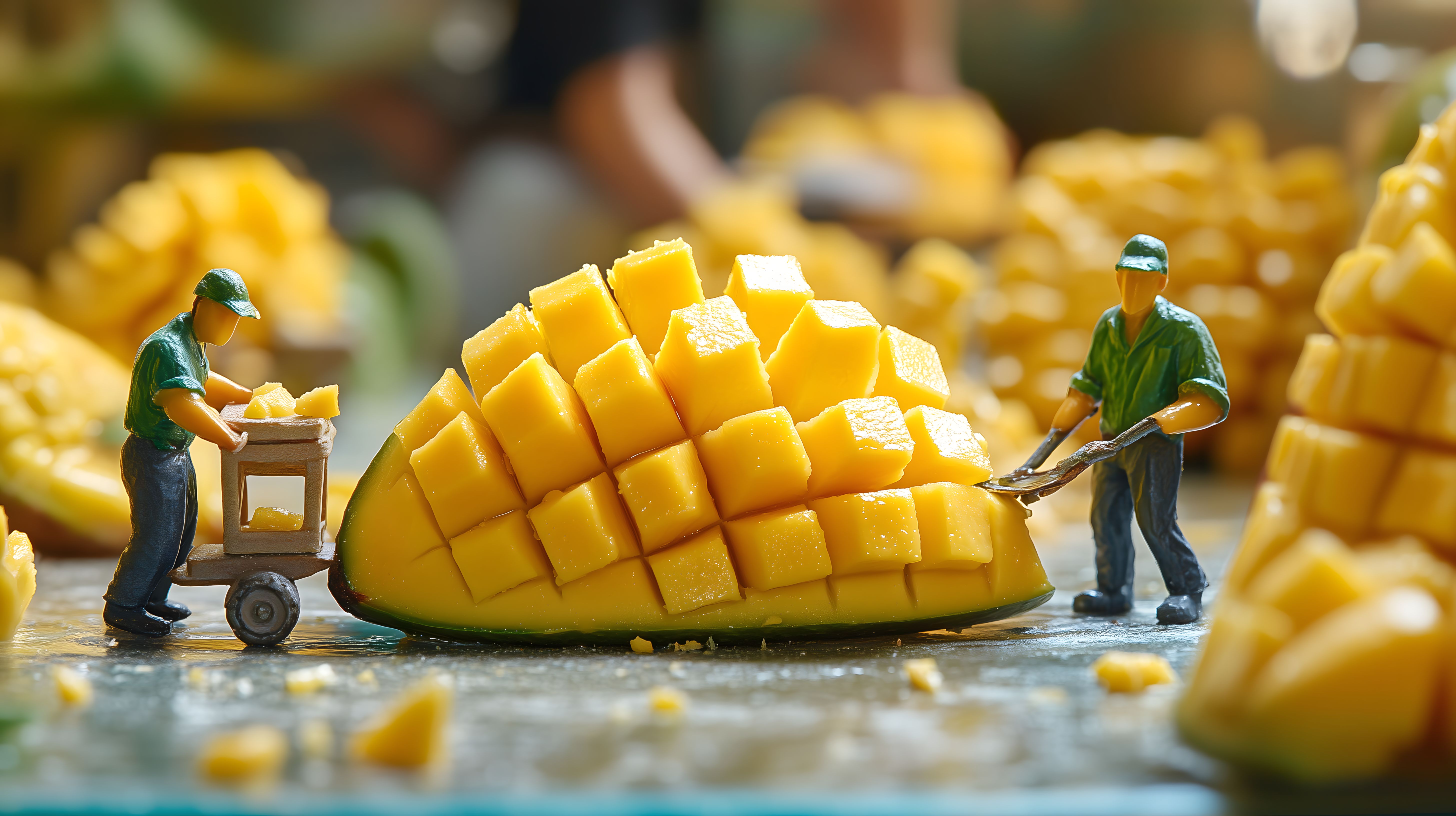 Dieses Foto zeigt eine übergroße, detailliert geschnittene Mango-Scheibe, die von zwei Miniatur-Figuren bearbeitet wird. Die Szenerie ist auf einem neutralen, aber strukturierten Untergrund platziert, was einen interessanten Kontrast zwischen Groß und Klein erzeugt. Die satten Gelbtöne der Mango, kombiniert mit den grünen Details der Miniatur-Figuren, sorgen für ein stimmungsvolles, natürliches Gesamtbild. Diese Aufnahme eignet sich hervorragend als kostenloses Stockfoto für Foodblogger, Gastronomie-Werbung oder kreative Layouts in hoher Auflösung und unter Creative-Commons-Lizenz.