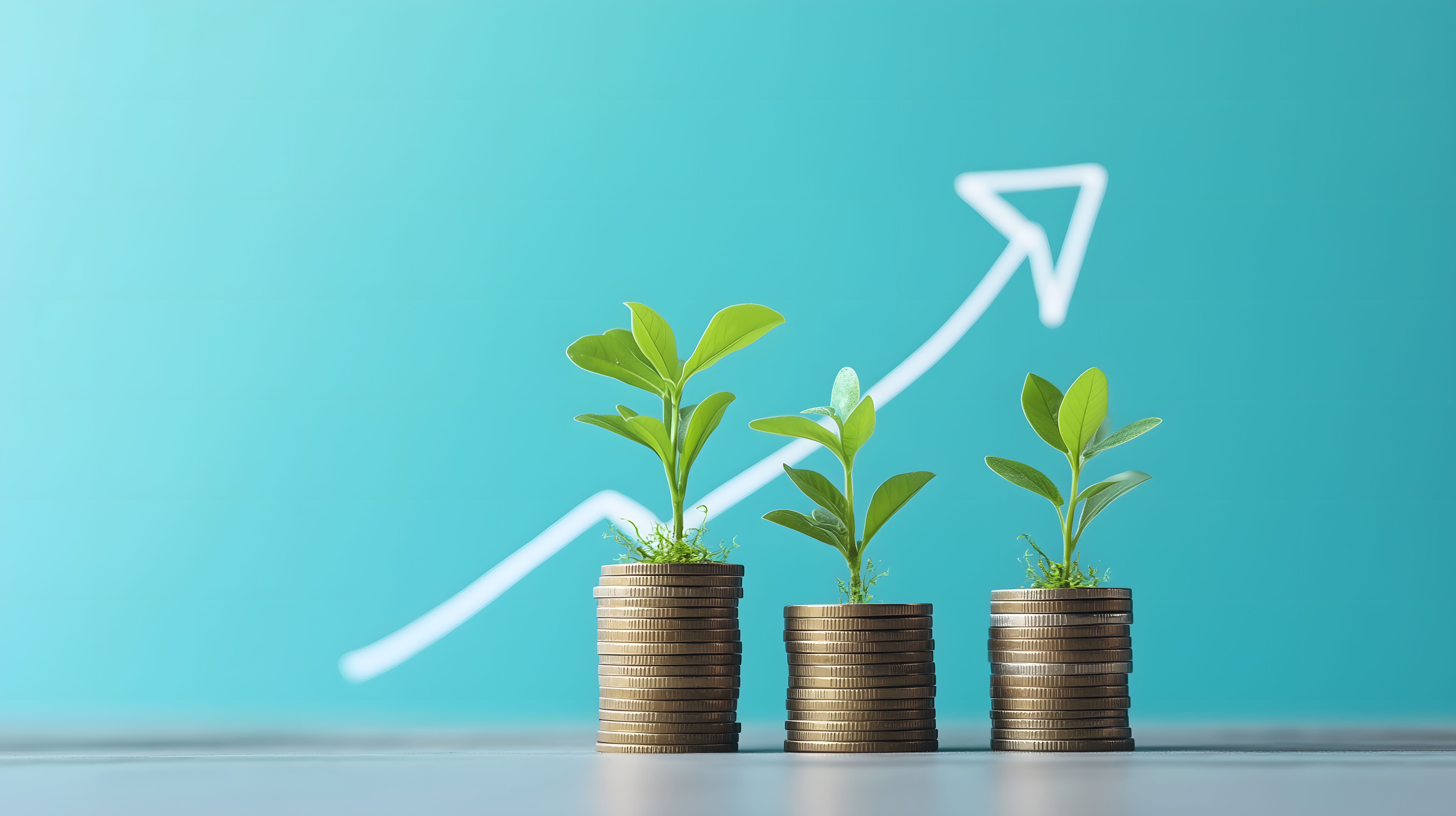 Das Foto zeigt ein symbolisches Bild für finanziellen Erfolg und Wachstum. Dargestellt sind Münzstapel, auf denen kleine Grünpflanzen wachsen, die von einem weißen Pfeil nach oben zeigen. Die klaren Linien und minimalistischen Farben verleihen dem Bild eine moderne und stilvolle Ästhetik. Diese Grafik eignet sich hervorragend für den Einsatz in Blogbeiträgen, Newslettern, sozialen Medien oder Werbematerialien zum Thema Finanzen, Investment und Unternehmenserfolg. Als kostenloses Stockfoto in hoher Auflösung und unter Creative-Commons-Lizenz kann es frei verwendet werden.