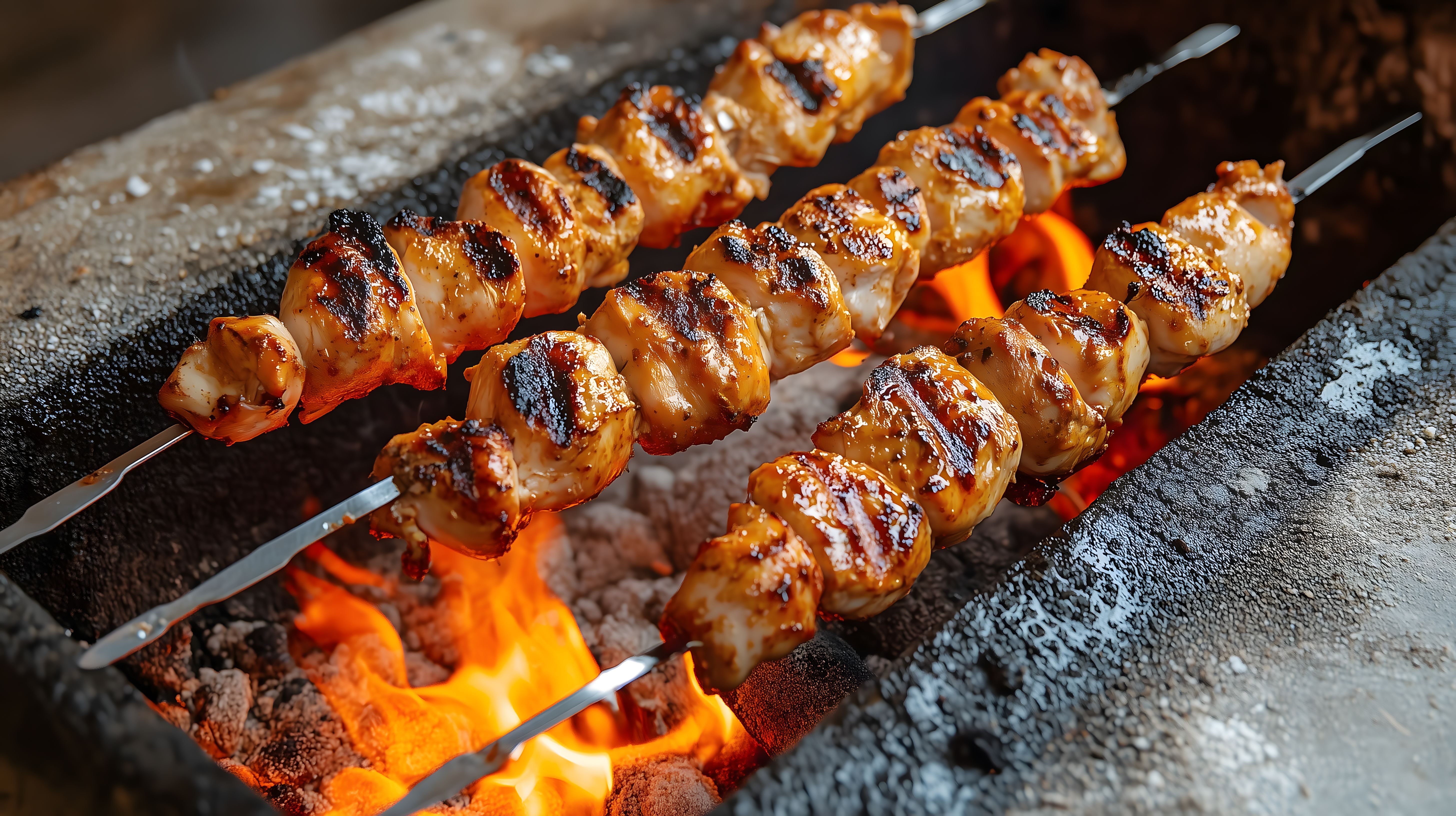 Das Bild zeigt leckere, gegrillte Hühnchenkebabs, die auf einem Holzkohlegrill zubereitet werden. Die Kebabs sind mit einer goldbraunen, karamelligen Marinade überzogen und zeigen eine appetitliche, leicht verkohlte Oberfläche. Das Arrangement auf dem rustikalen Holzbrett verleiht dem Motiv eine authentische, traditionelle Optik, die perfekt zur Zubereitung von Grillgerichten passt. Dieses hochaufgelöste Stockfoto eignet sich hervorragend für die Verwendung in Blogs, Newslettern, Social-Media-Beiträgen oder Werbematerialien rund um das Thema Grillen, Fleischzubereitung und authentische, regionale Küche.