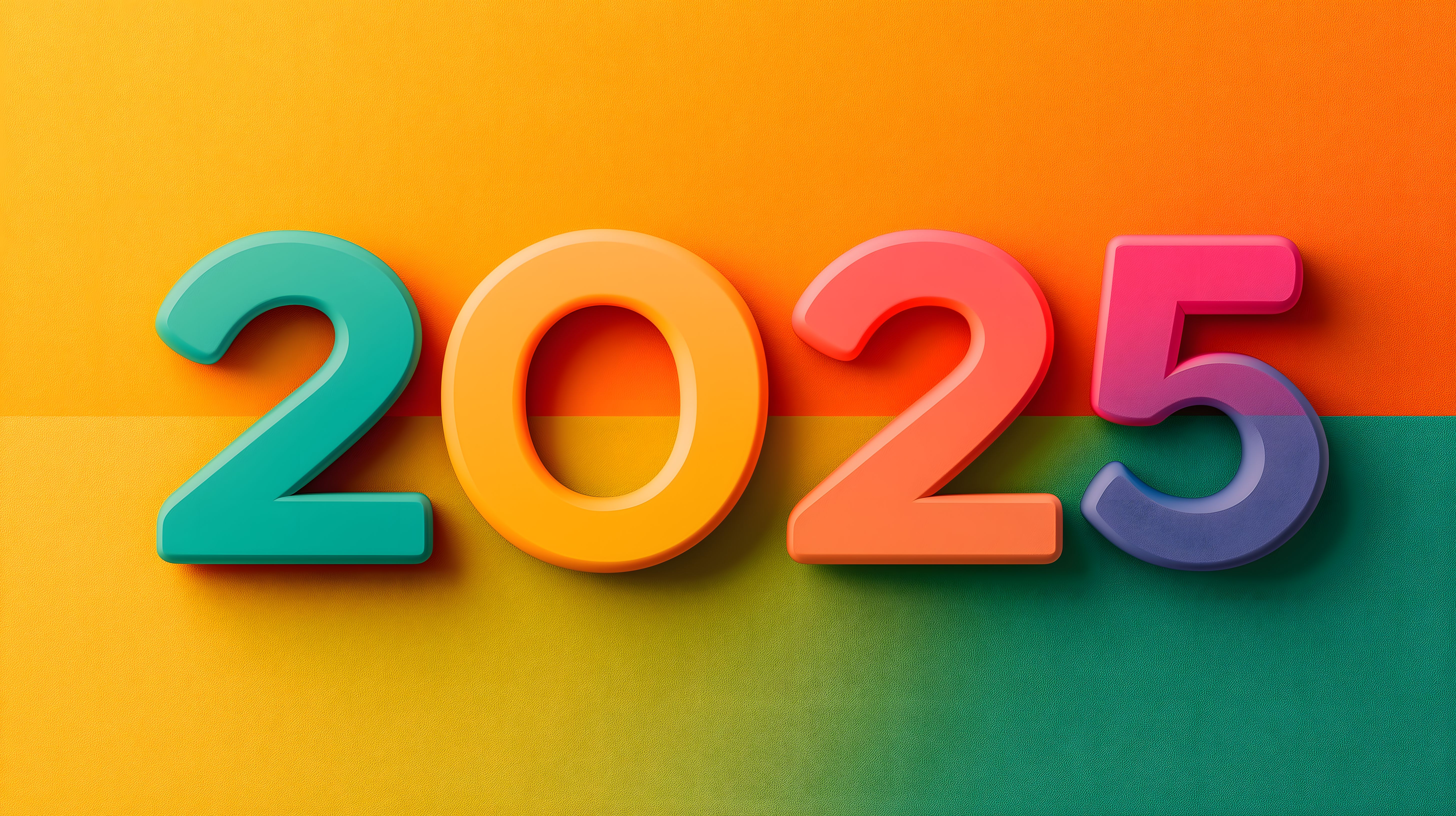 Dieses farbenfrohes Stockfoto zeigt die Zahlen 2025 in einer modernen, geometrischen Darstellung auf einem hell-orangefarbenen Hintergrund. Die Ziffern sind in verschiedenen Trendfarben wie Türkis, Orange und Pink gehalten, die einen auffallenden Kontrast zum einfarbigen Hintergrund bilden. Die Komposition ist minimalistisch und reduziert, wodurch die Zahlen als grafisches Element im Mittelpunkt stehen.